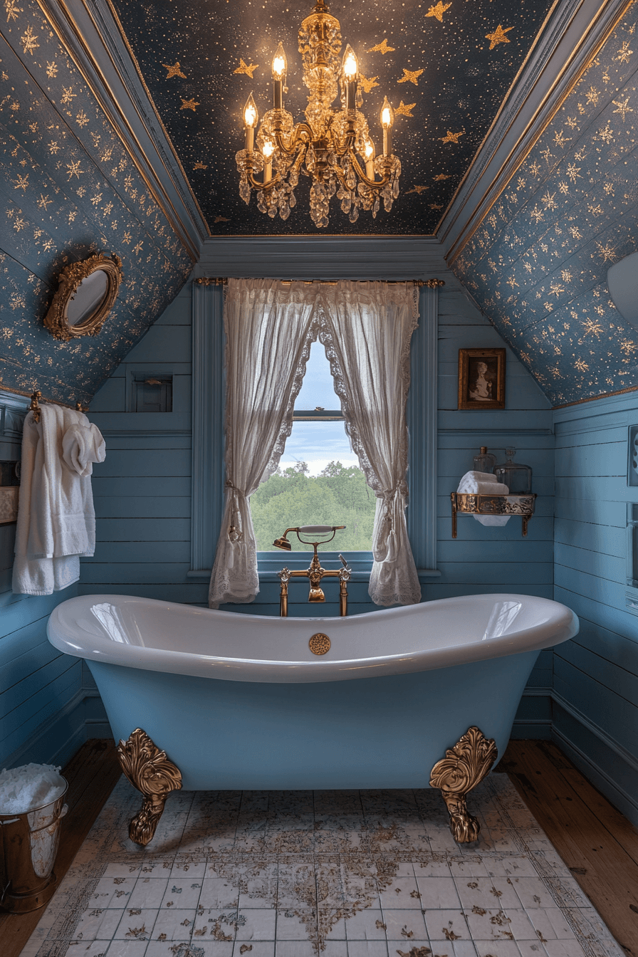 Light blue tones paired with golden accents create an airy, celestial-inspired atmosphere. Soft star-patterned details add whimsy and charm. A vintage tub surrounded by mirrored furnishings enhances the glowing effect. Crystal lighting brings a delicate brightness to the space. The room feels dreamlike, peaceful, and beautifully harmonious.