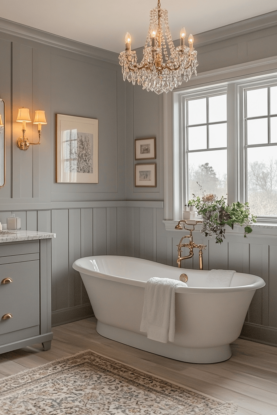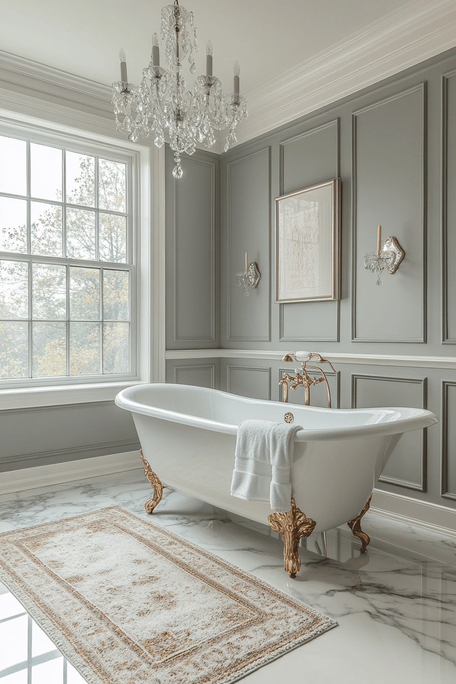 Soft silver and gray tones fill the room with calm, cool elegance. Gold accents add a hint of warmth without overpowering the palette. A silver-trimmed clawfoot tub anchors the design with classic charm. Crystal chandeliers cast a gentle sparkle that enhances the serene atmosphere. The combination of metals and soft hues creates a refined, tranquil retreat.