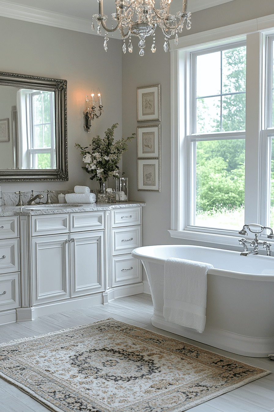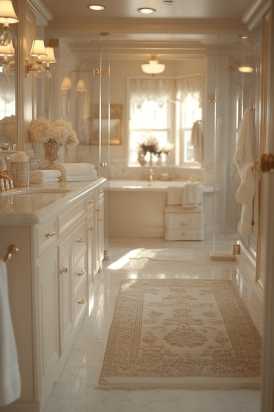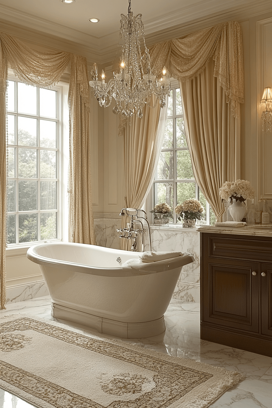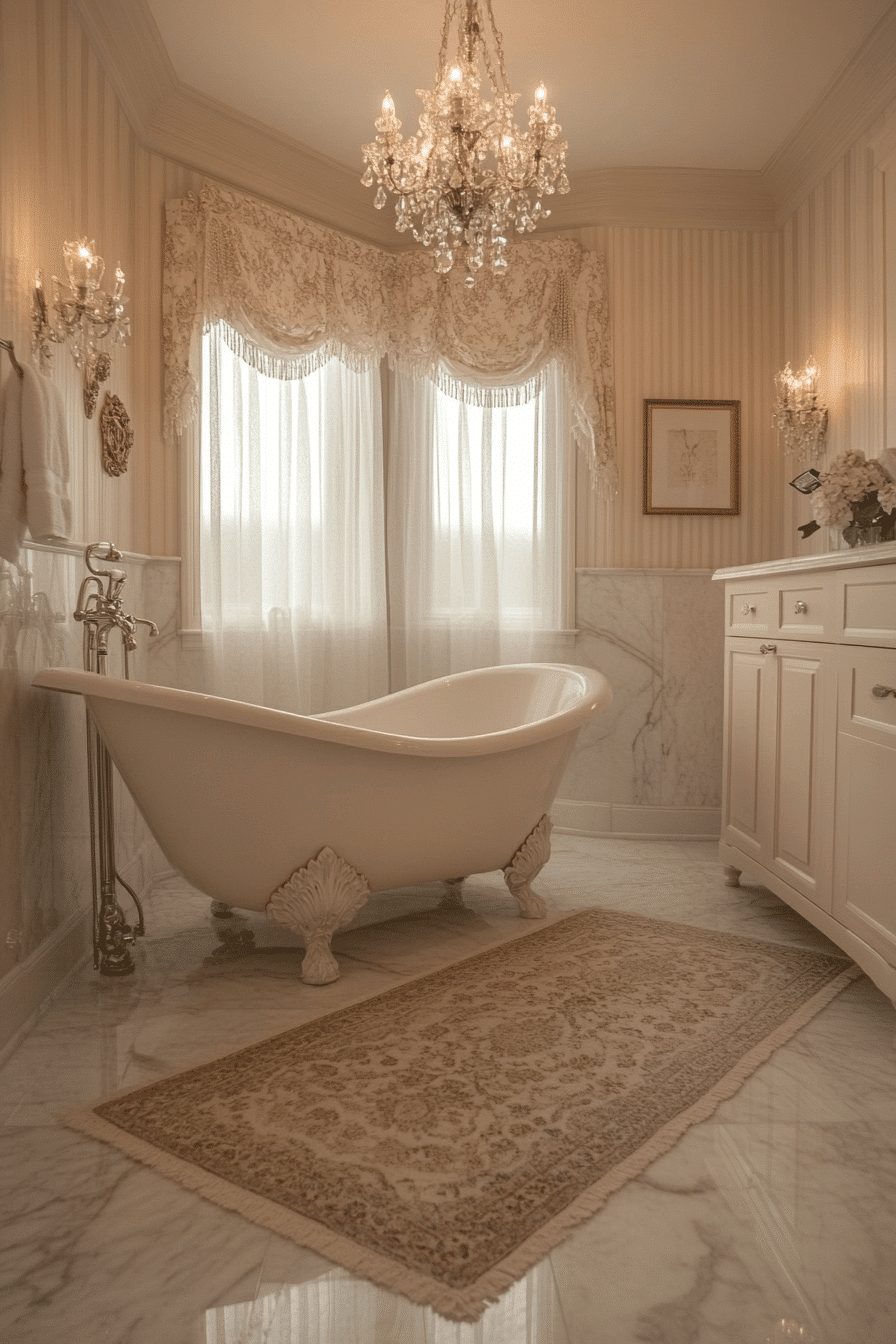 Gold and crystal accents combine with soft pastel tones to create a luxurious oasis. A vintage tub becomes a stunning focal point in the radiant layout. Marble floors add sophistication while plush rugs soften the space. Floral details throughout the room enhance the gentle elegance. Every detail feels extravagant yet soothing.