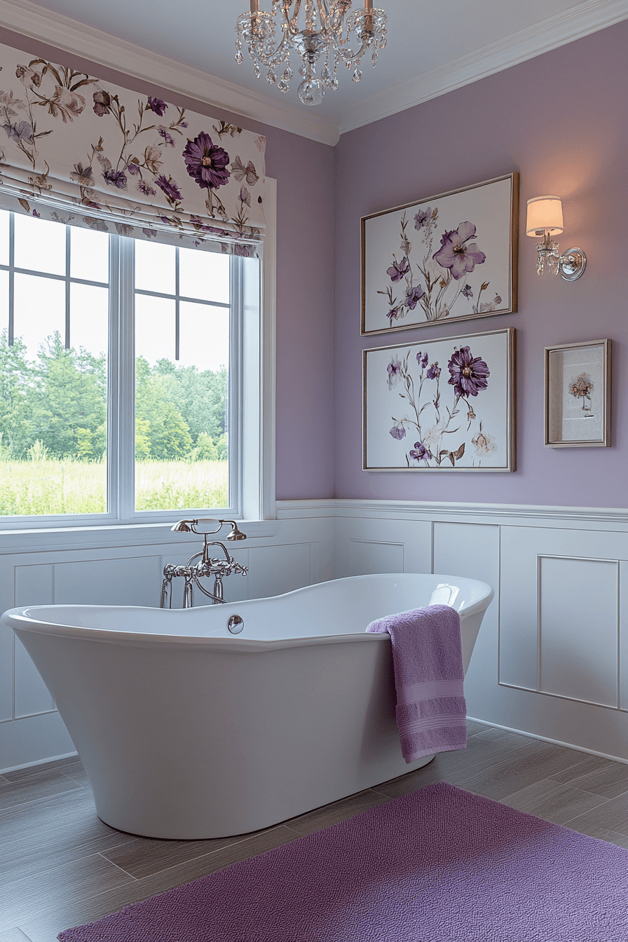 Lavender tones introduce calmness and romantic charm. Gold detailing pairs against the soft purple for an elegant contrast. Crystal lights create a warm, inviting glow across the gentle palette. Floral patterns and soft fabrics enhance the peaceful feeling. The space feels calming, feminine, and effortlessly graceful.