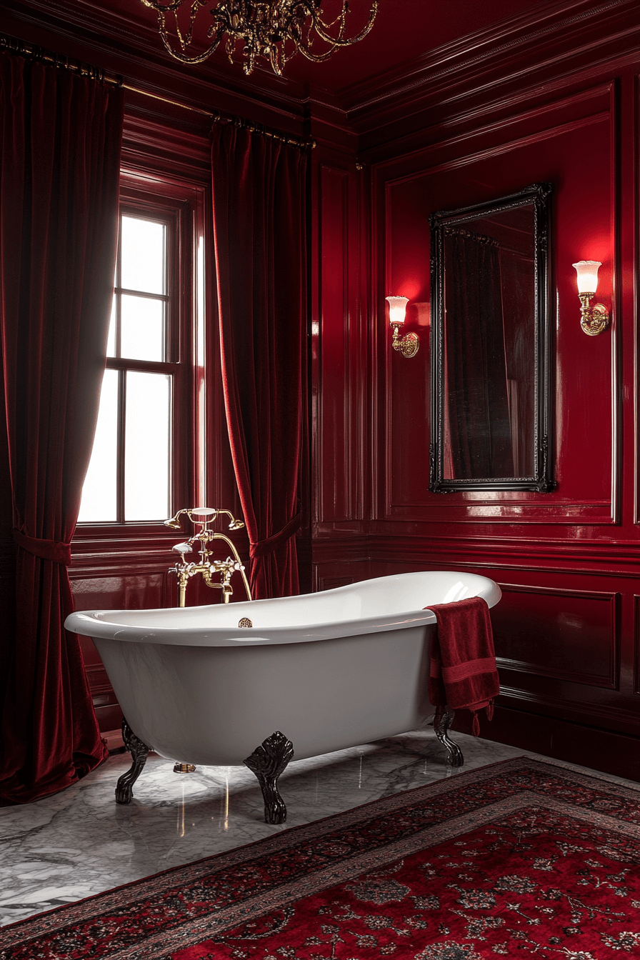 Deep crimson walls set a dramatic and regal mood, instantly drawing the eye. Gold-trimmed mirrors and glowing sconces add a warm, inviting light that softens the bold palette. Velvet drapery and an ornate clawfoot tub bring both luxury and comfort. Rich textures spread throughout the space, making it feel decadent yet cozy. It’s the perfect choice for someone who loves strong color and historical flair.
