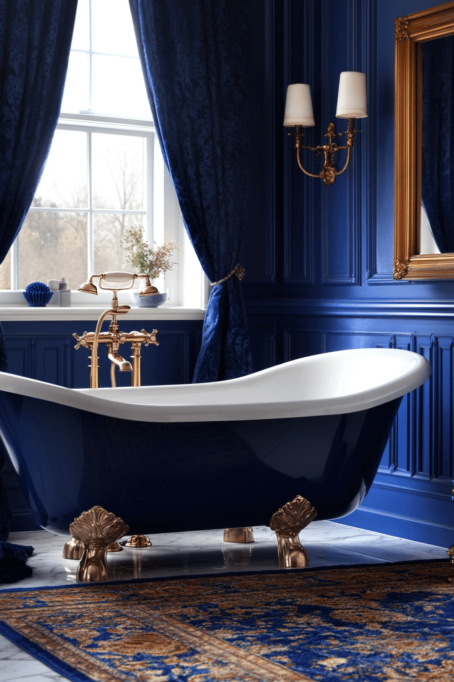 Sapphire tones wrap the room in a serene, jewel-like richness. Gold details along mirrors and fixtures add warmth, creating a balanced and regal look. A clawfoot tub beneath soft lighting becomes the perfect spot to unwind. Deep navy curtains provide privacy while enhancing the dramatic palette. Every detail contributes to a calm, luxurious moment of escape.