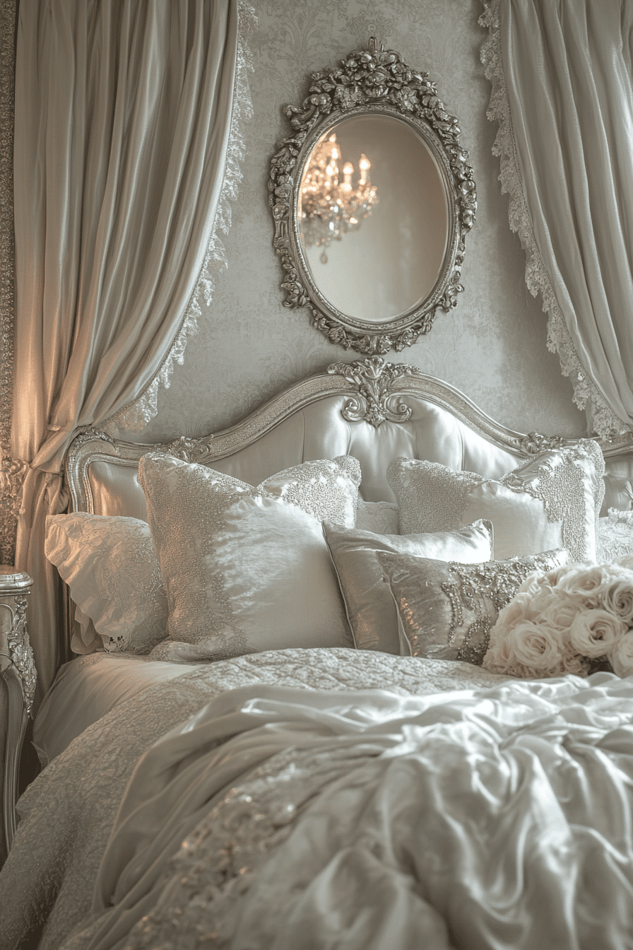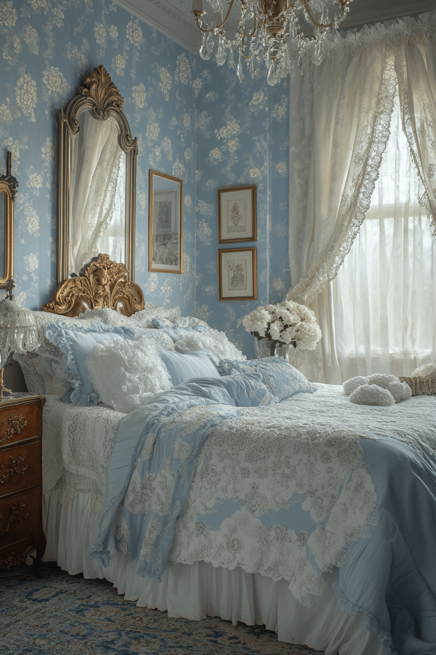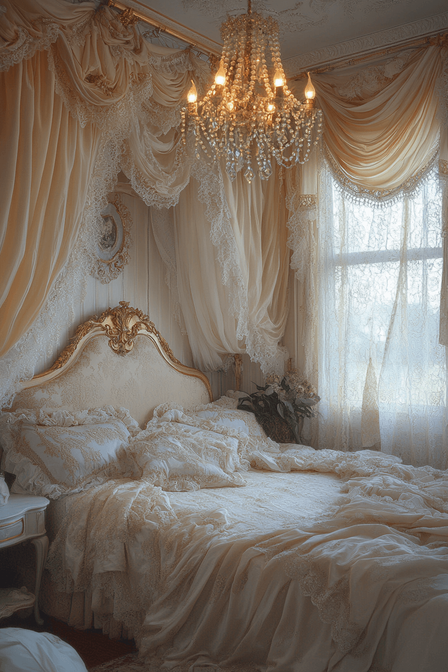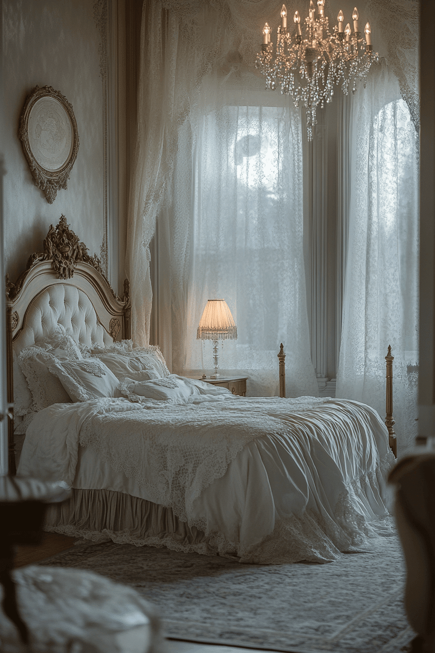 Delicate lace patterns soften the atmosphere with their romantic charm, appearing in curtains, bedding, and decor details. Pastel hues heighten the lightness of the design, contributing to a serene and airy feel. Velvet and satin accents add just enough richness to balance the softness. Ambient lighting and antique mirrors enhance the gentle textures throughout the room. Everything feels graceful, peaceful, and beautifully layered.