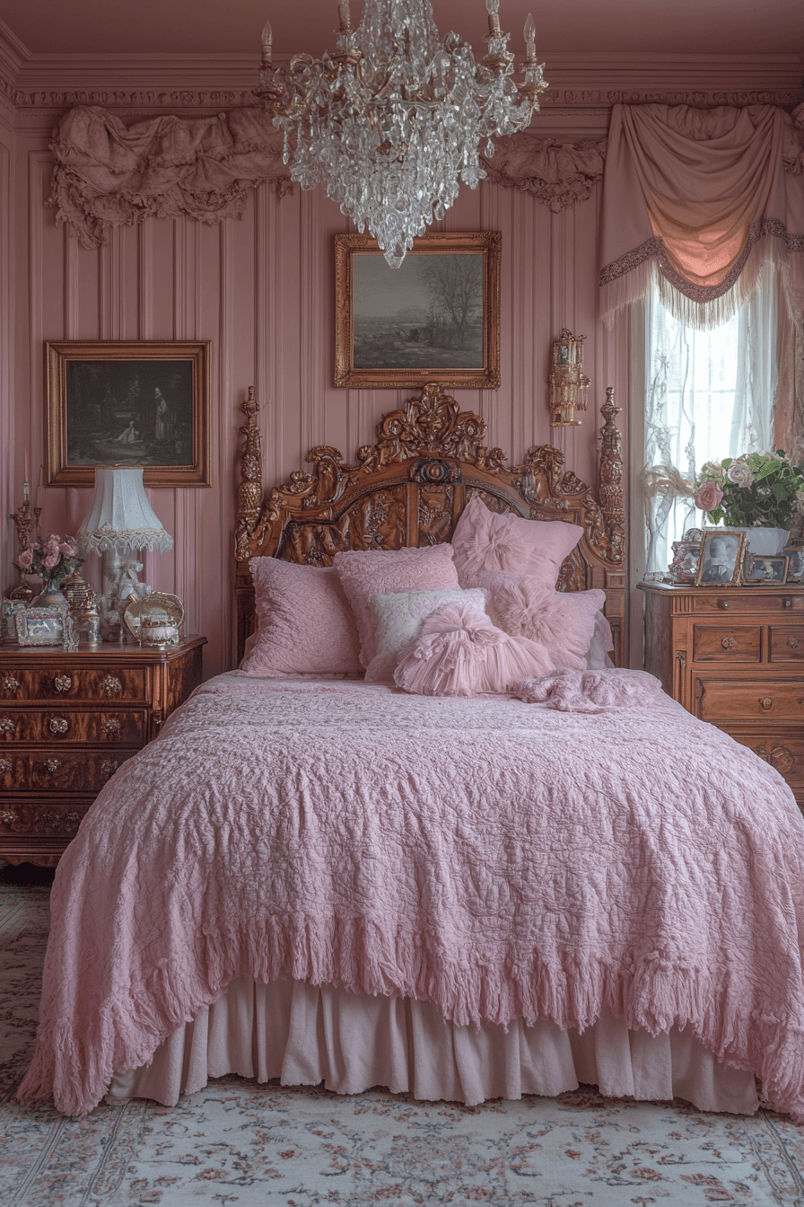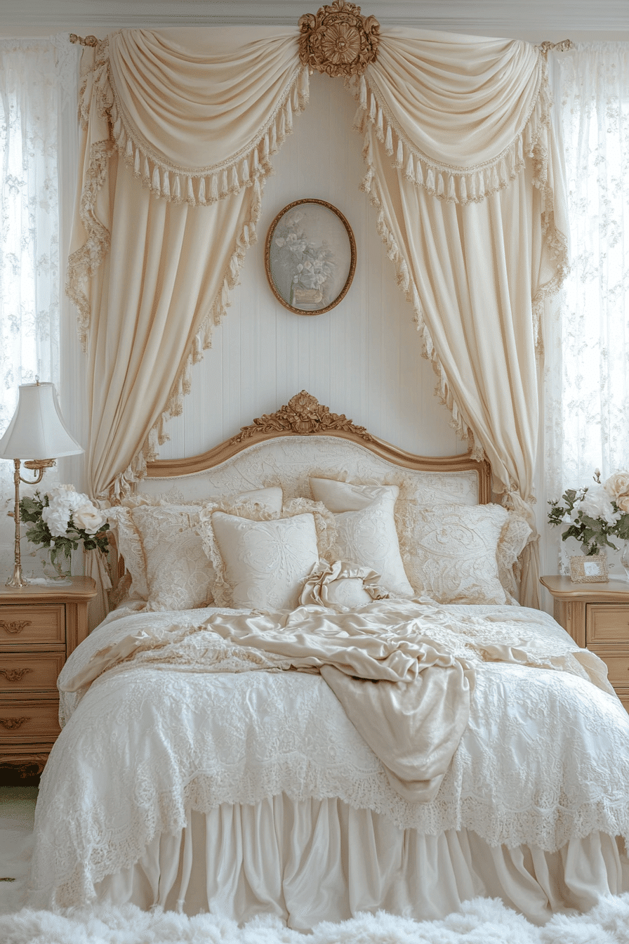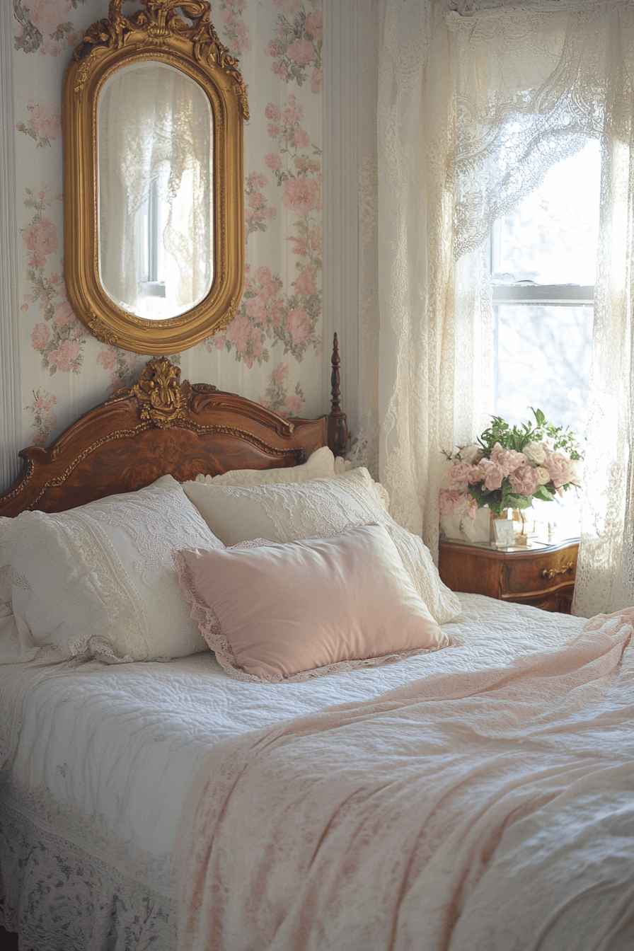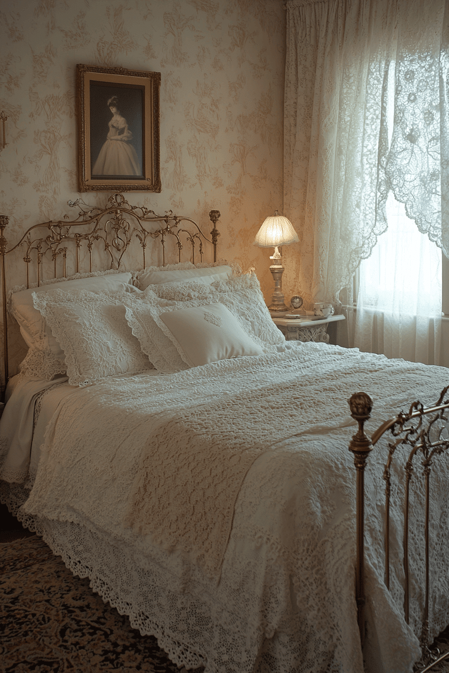 Delicate lace patterns soften the atmosphere with their romantic charm, appearing in curtains, bedding, and decor details. Pastel hues heighten the lightness of the design, contributing to a serene and airy feel. Velvet and satin accents add just enough richness to balance the softness. Ambient lighting and antique mirrors enhance the gentle textures throughout the room. Everything feels graceful, peaceful, and beautifully layered.