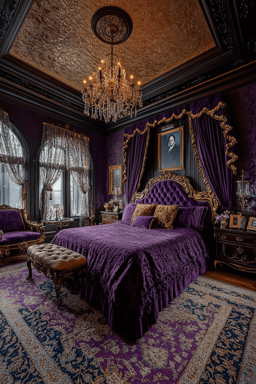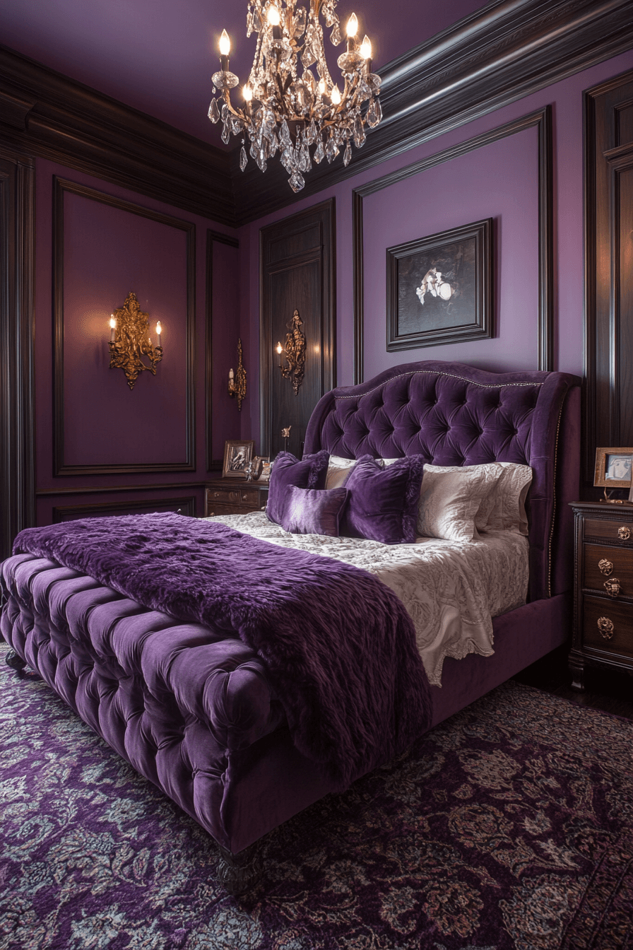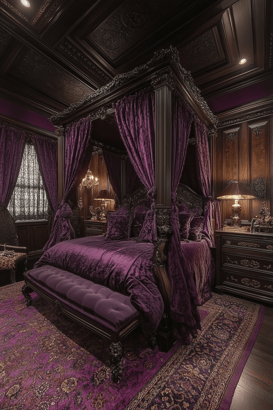 Deep plum tones bring depth and elegance to the room while golden highlights brighten the palette with sophistication. Velvet bedding provides tactile richness, and dark wood paneling enhances the luxurious atmosphere. Soft lighting casts a warm glow over the dramatic hues. Rich textures create an environment that feels intimate and serene.
