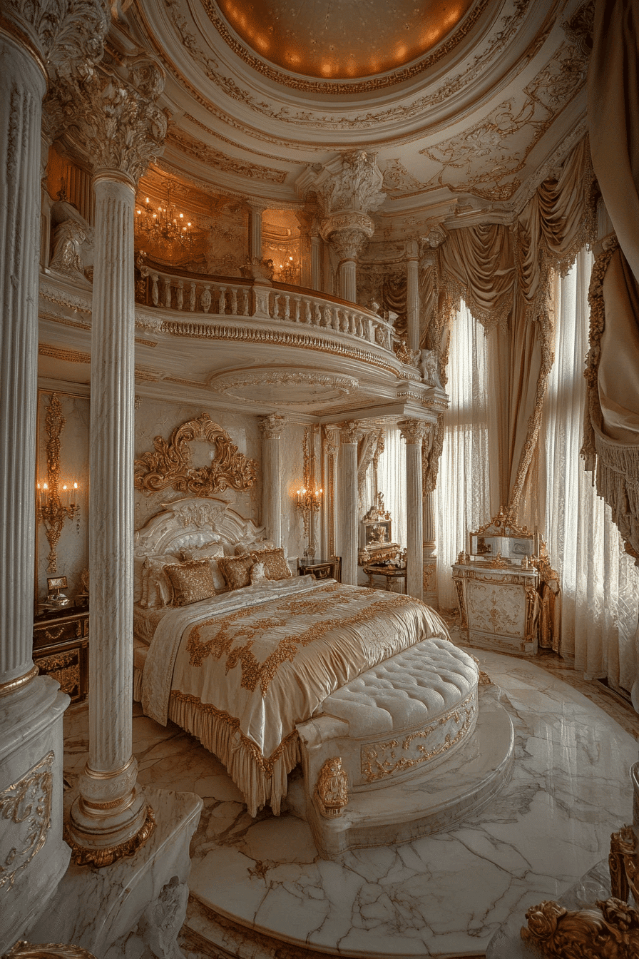 Glistening gold fabrics and embroidered accents bring a radiant elegance that instantly brightens the space. Jewel-toned bedding enhances the richness of the palette while intricate patterns add visual interest. A grand bed frame completes the focal point with its commanding presence. Warm lighting deepens the golden glow, creating a soothing yet opulent environment. The result is a space that feels luxurious but wonderfully peaceful.