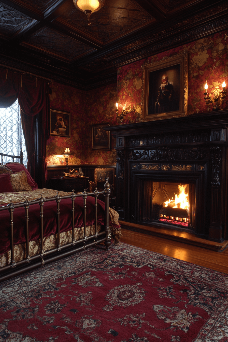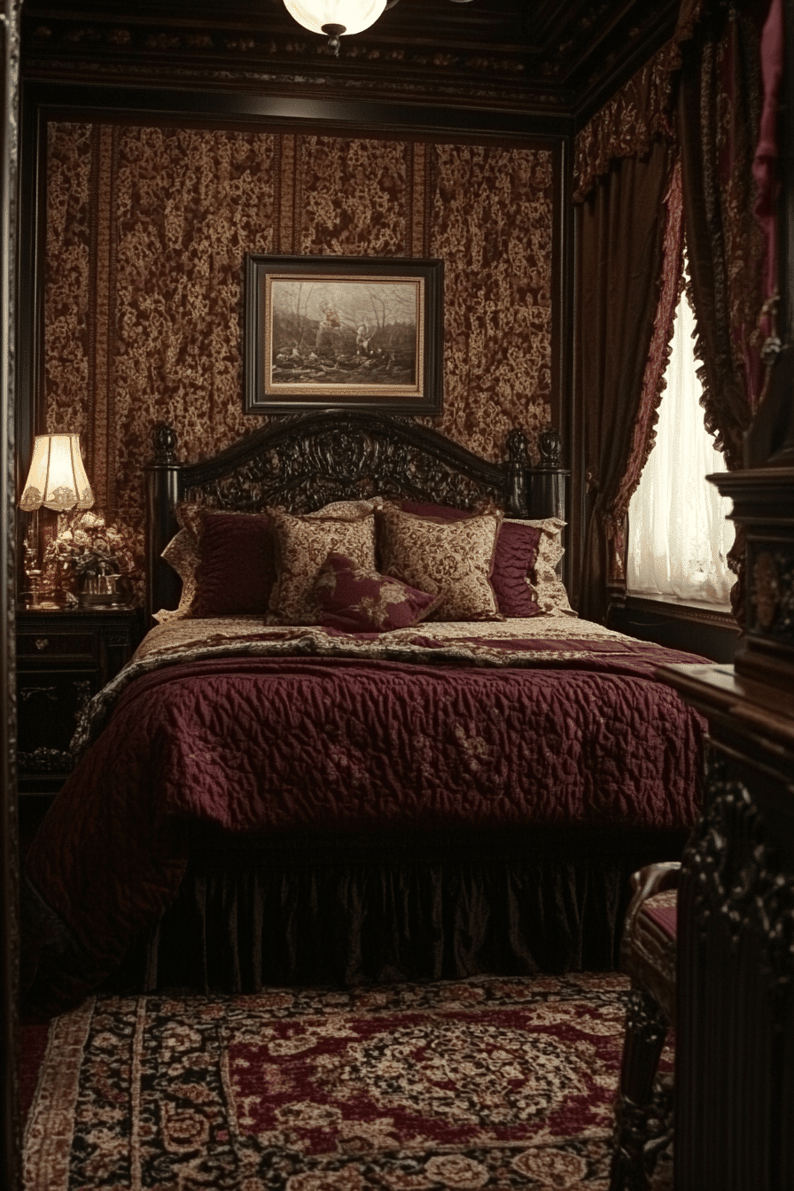 Crimson velvet adds drama and indulgence, saturating the space with romantic energy. Gold details reinforce the richness of the palette. Ornate wood furniture deepens the classic Victorian feel. Patterned rugs warm the room visually. Everything comes together to form a luxurious, timeless retreat.