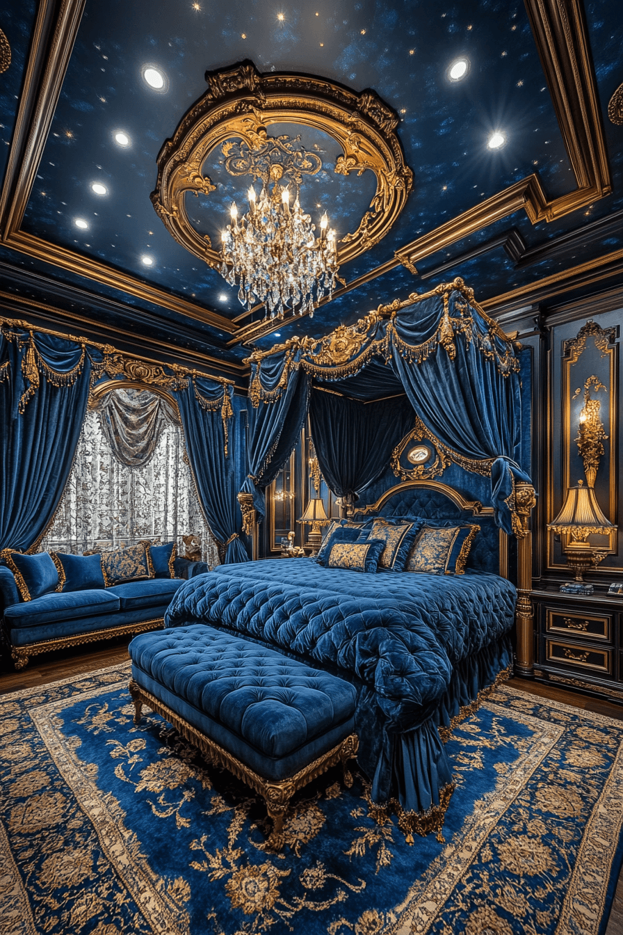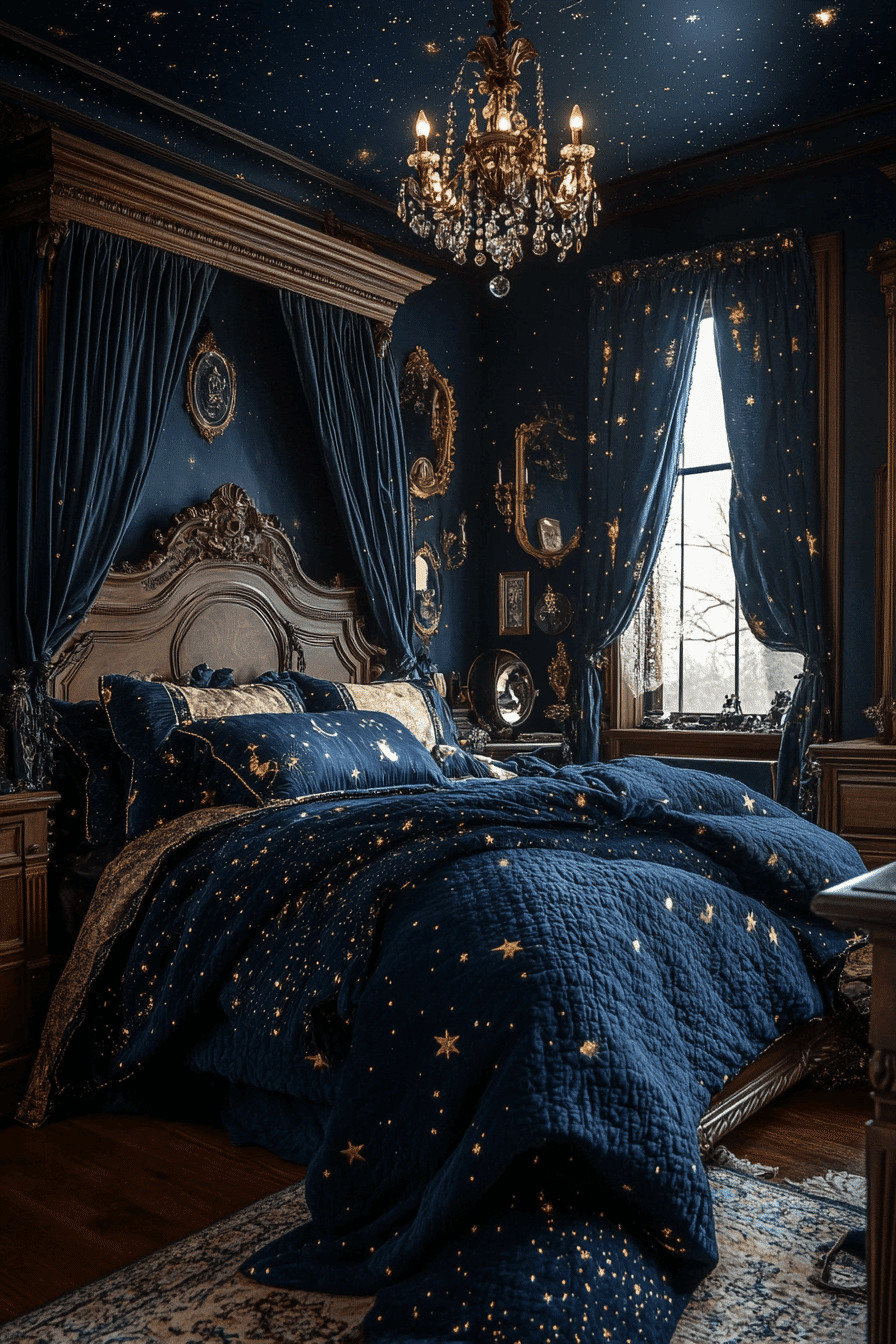 Deep blue walls paired with shimmering gold accents create an enchanting, celestial-inspired atmosphere. Velvet bedding intensifies the richness of the palette. The windows, framed with heavy drapery, enhance the room’s dramatic presence. A sparkling chandelier scatters warm reflections throughout. Star-like decor elements subtly reinforce the theme without overwhelming it.