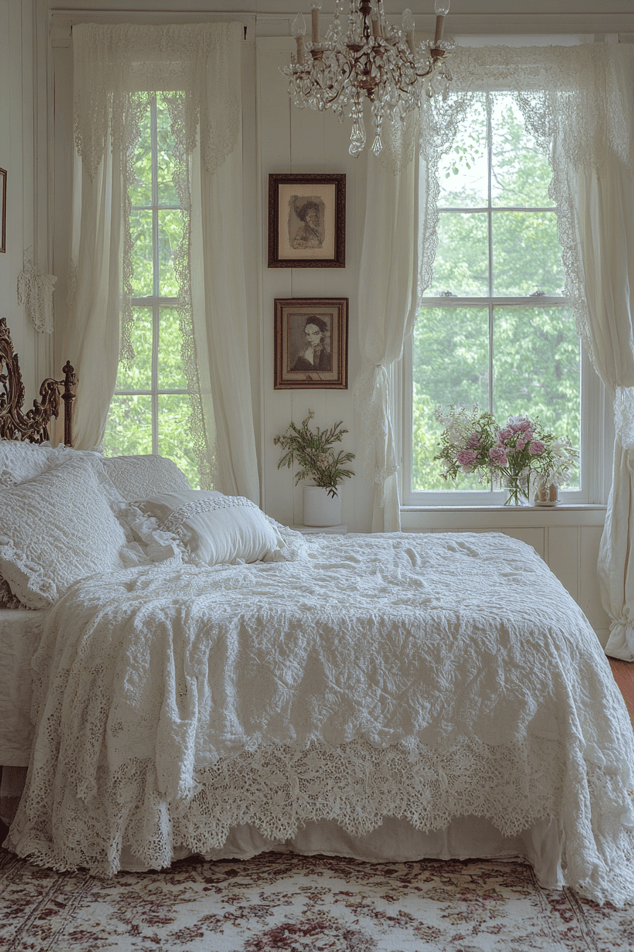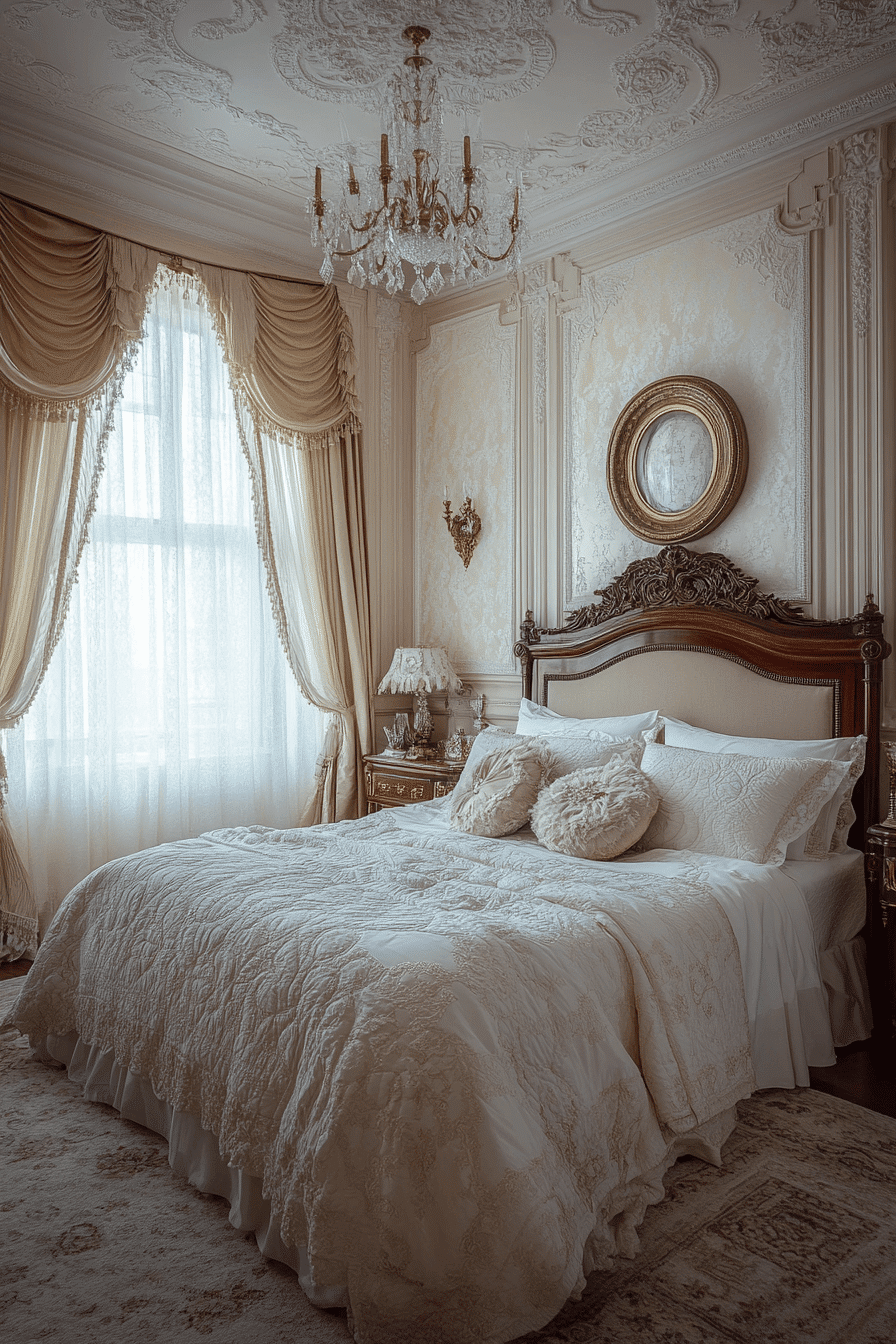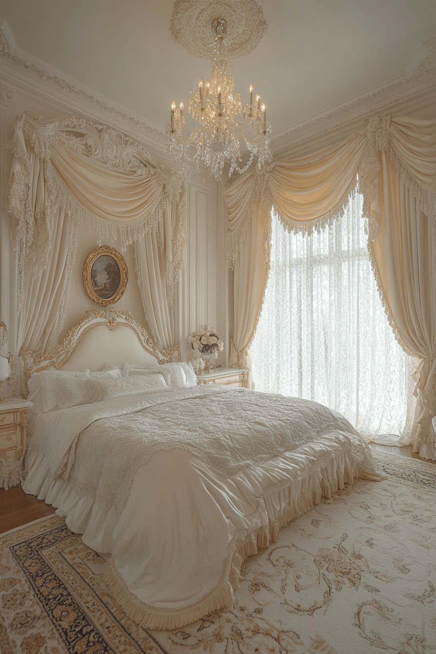 Soft ivory fabrics drape the room in gentle calm, blending beautifully with delicate lace details and subtle textural elements. Antique-style furniture in light finishes keeps the space feeling airy while still exuding classic charm. Subtle florals in bedding or upholstery introduce quiet romance. Crystal lighting enhances the serene palette with its soft sparkle. Everything works together to create a restful, timeless sanctuary.