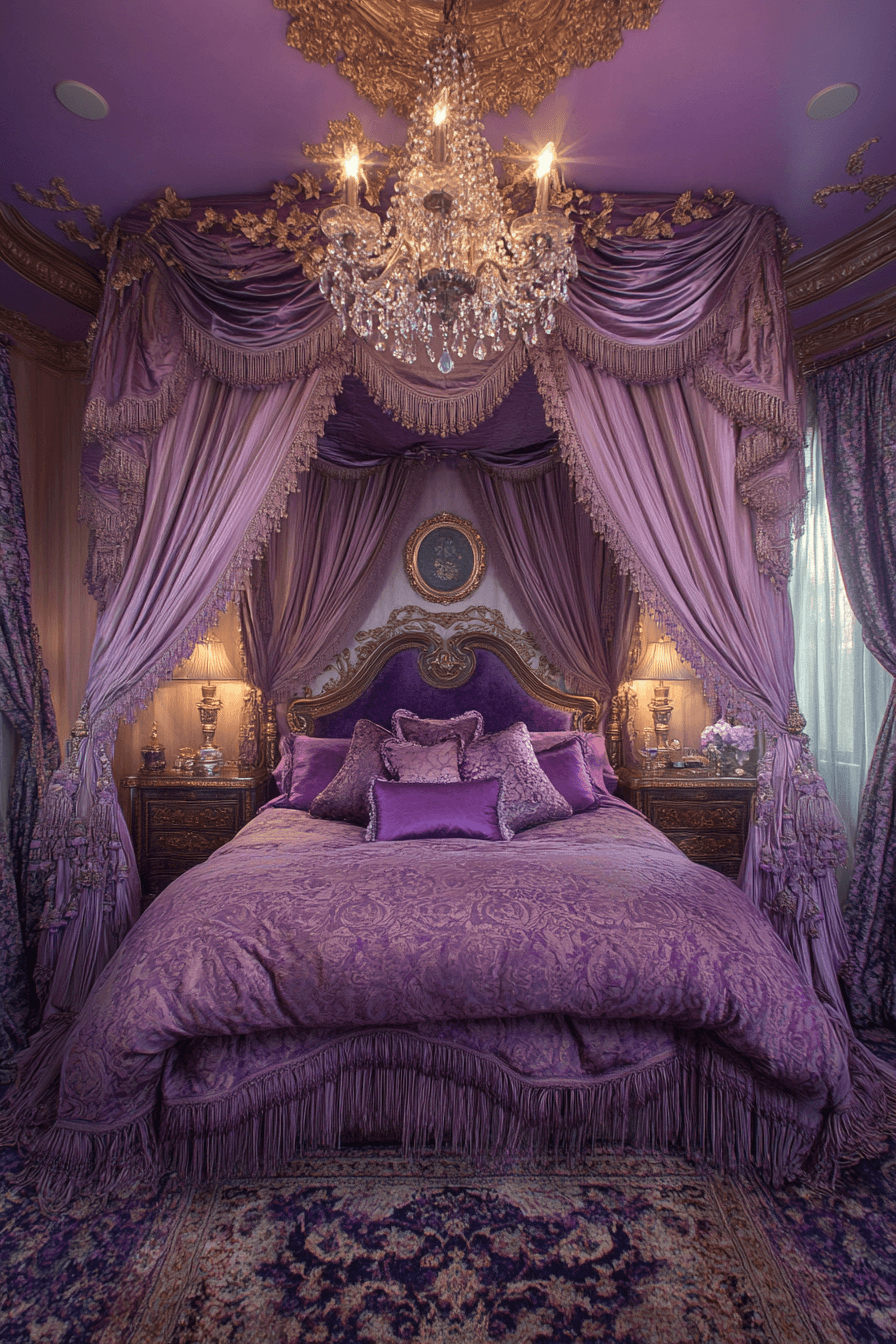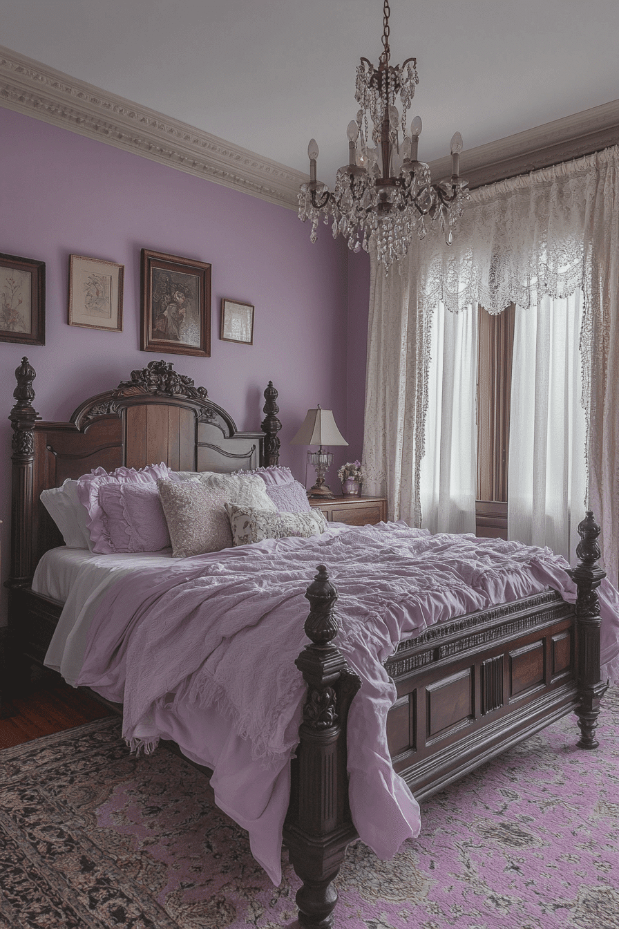 Lavender tones blend with dark wood and gold accents to create a mystical, serene environment. Satin and linen bedding offer a calming contrast. Warm lighting highlights the soft palette beautifully. Patterned rugs add romantic charm beneath your feet. The entire space feels enchanting and peaceful.