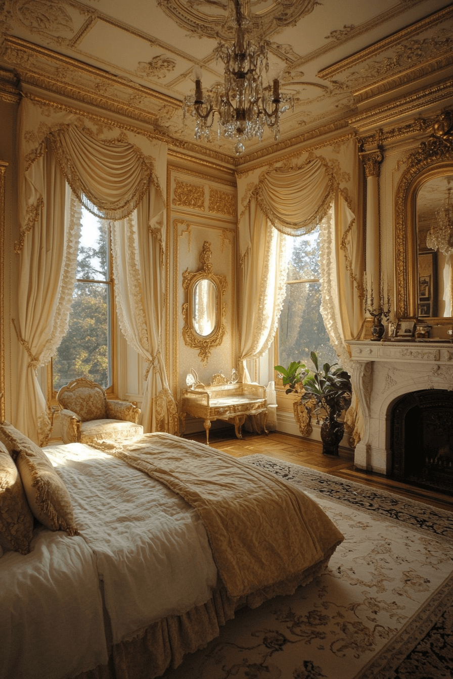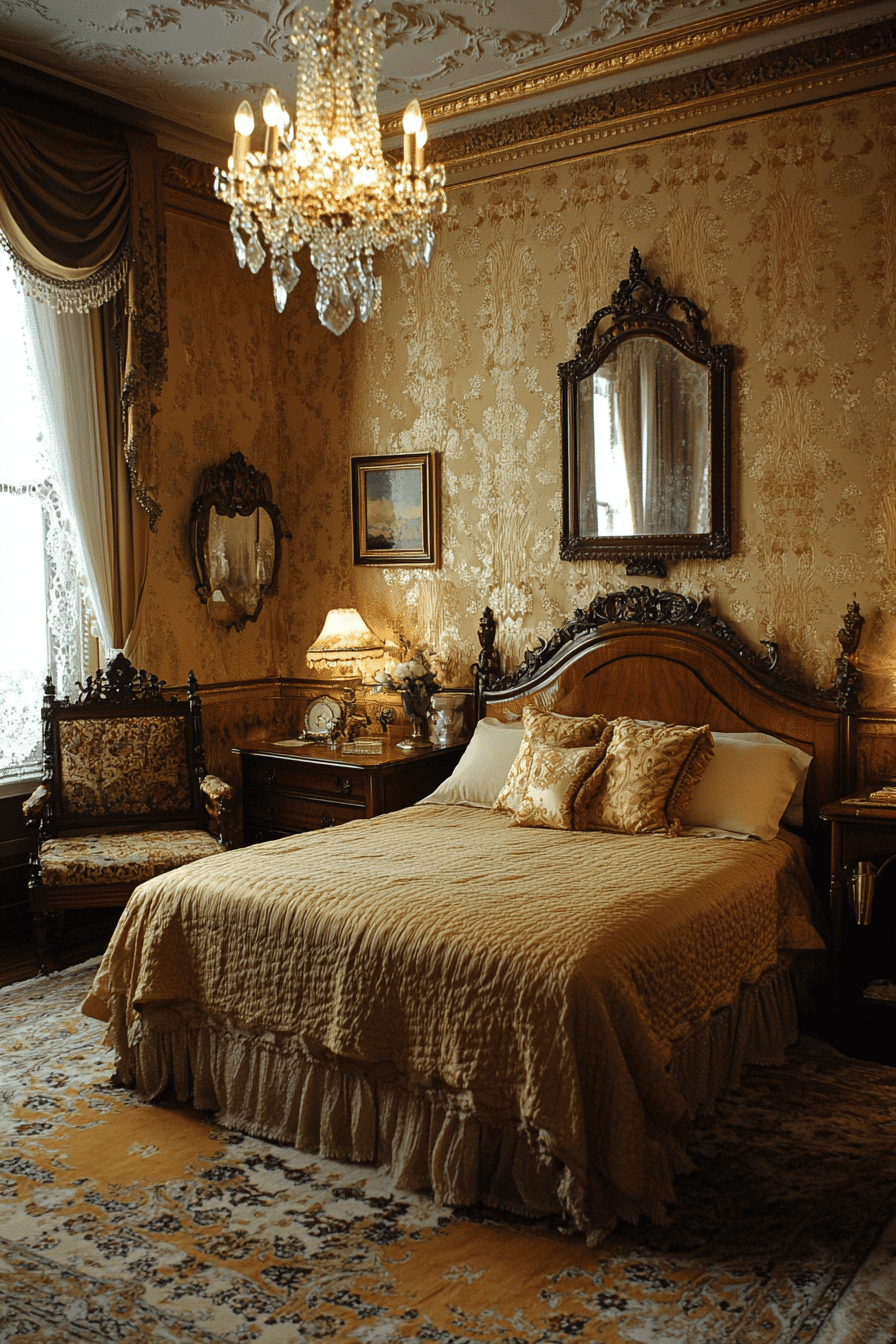 Sumptuous textures fill the room with undeniable warmth as velvet bedding, drapery, and upholstery create a cocoon-like atmosphere that feels indulgent and serene. Deep jewel tones enhance the sense of luxury, while golden trims add a soft glow to every corner. Classic wallpaper contributes pattern and charm without overpowering the richness of the fabrics. Crystal lighting scatters subtle reflections that elevate the room’s romantic appeal. The entire space feels like a lavish retreat crafted for true comfort.