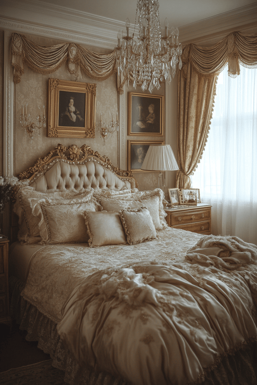 Silky textures and embroidered drapery create an elegant, layered setting. Soft blush, cream, and pale gold tones brighten the space with refined charm. Antique furniture adds history and sophistication. A sparkling chandelier brings warmth and romantic illumination. Every textile contributes to a sense of quiet luxury.