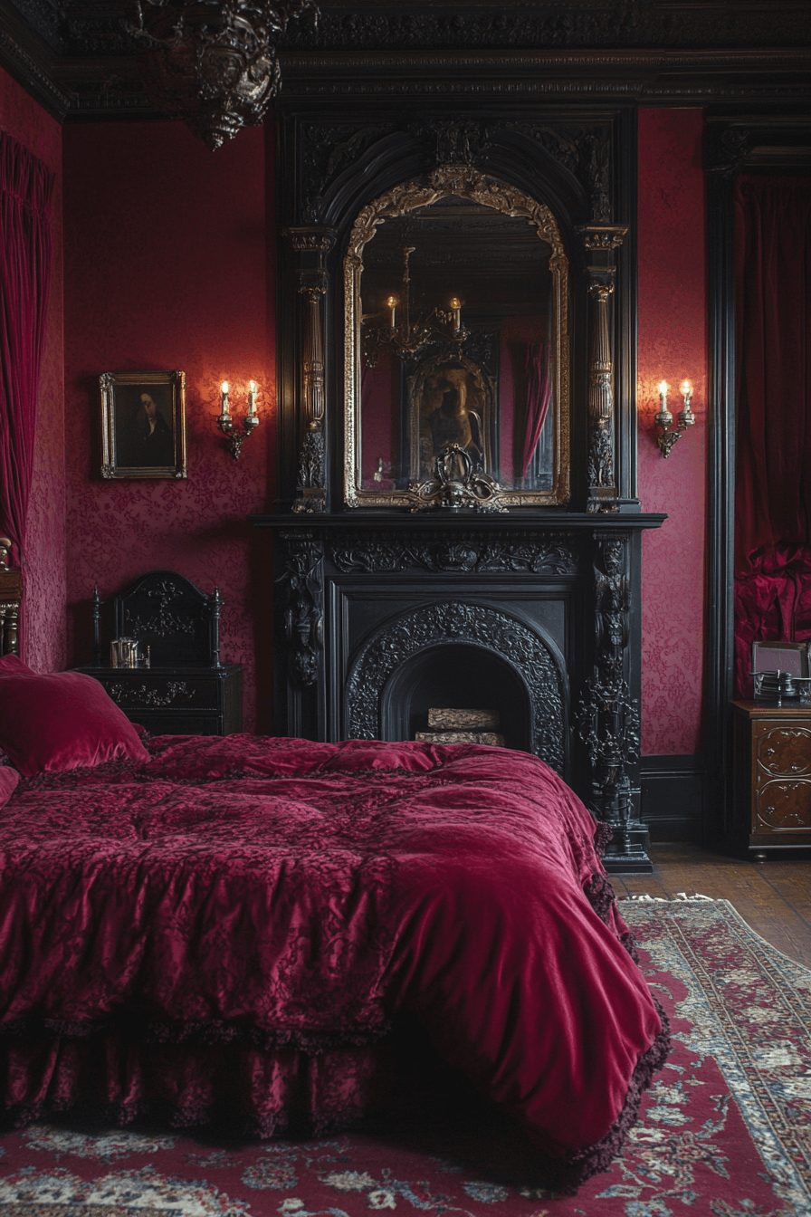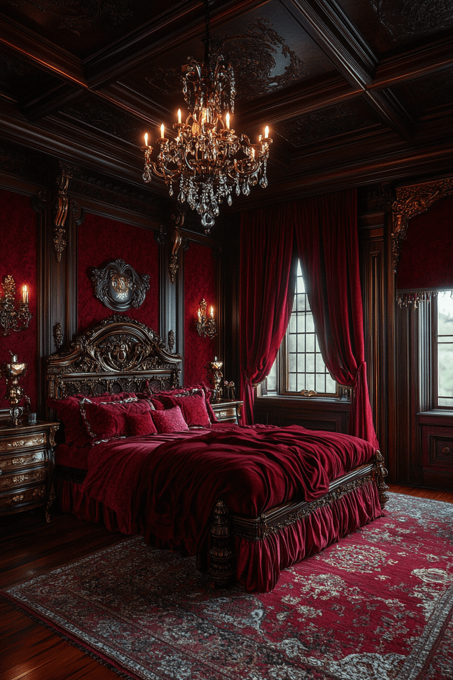 Rich crimson hues bring passion and vibrancy to the room, creating an atmosphere that feels powerful yet deeply inviting. Plush fabrics add depth and drama, especially when accented with warm lighting and gilded decorative elements. A canopy bed or carved headboard becomes a striking centerpiece that anchors the palette beautifully. Dark woods balance the bold tones with grounding warmth. Every detail contributes to a regal, intimate retreat.