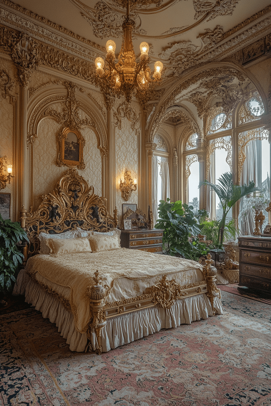 Rich brocade fabrics introduce dramatic texture and pattern throughout the room, making every corner feel luxurious. Ornate headboards and carved furnishings add grandeur. Gold-framed artwork deepens the opulent theme. Thick rugs add comfort and visual weight. The result is deeply textured, elegant, and full of personality.