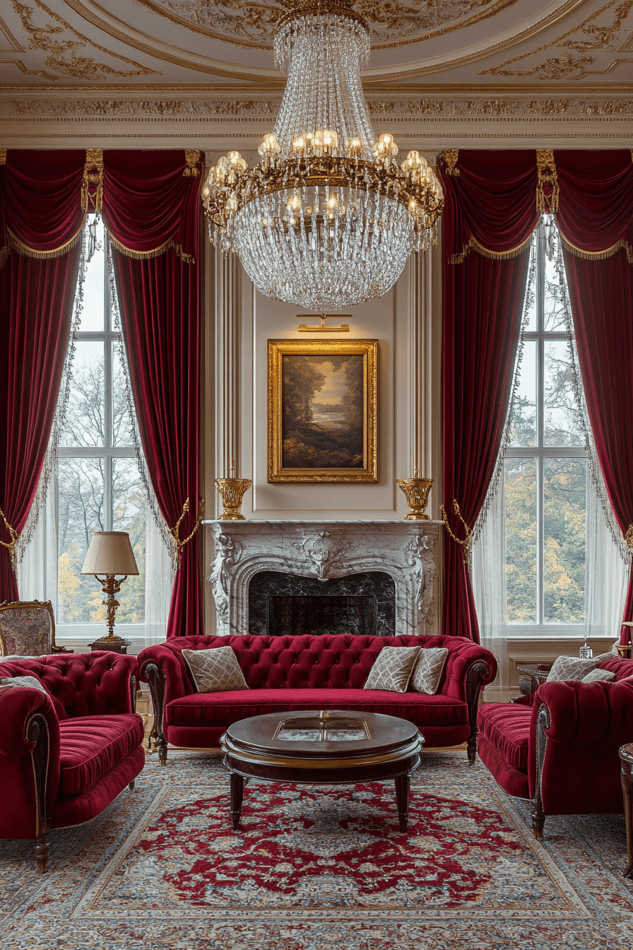 Rich crimson fabrics fill the space with warmth and depth, creating a mood that feels comforting yet regal. Gold accents shimmer softly against the deep hues, enhancing the historical charm. Plush seating encourages relaxation, while layered drapery adds movement and elegance. Carved wood details anchor the palette with timeless sophistication. A crystal chandelier casts a glowing sparkle over everything.