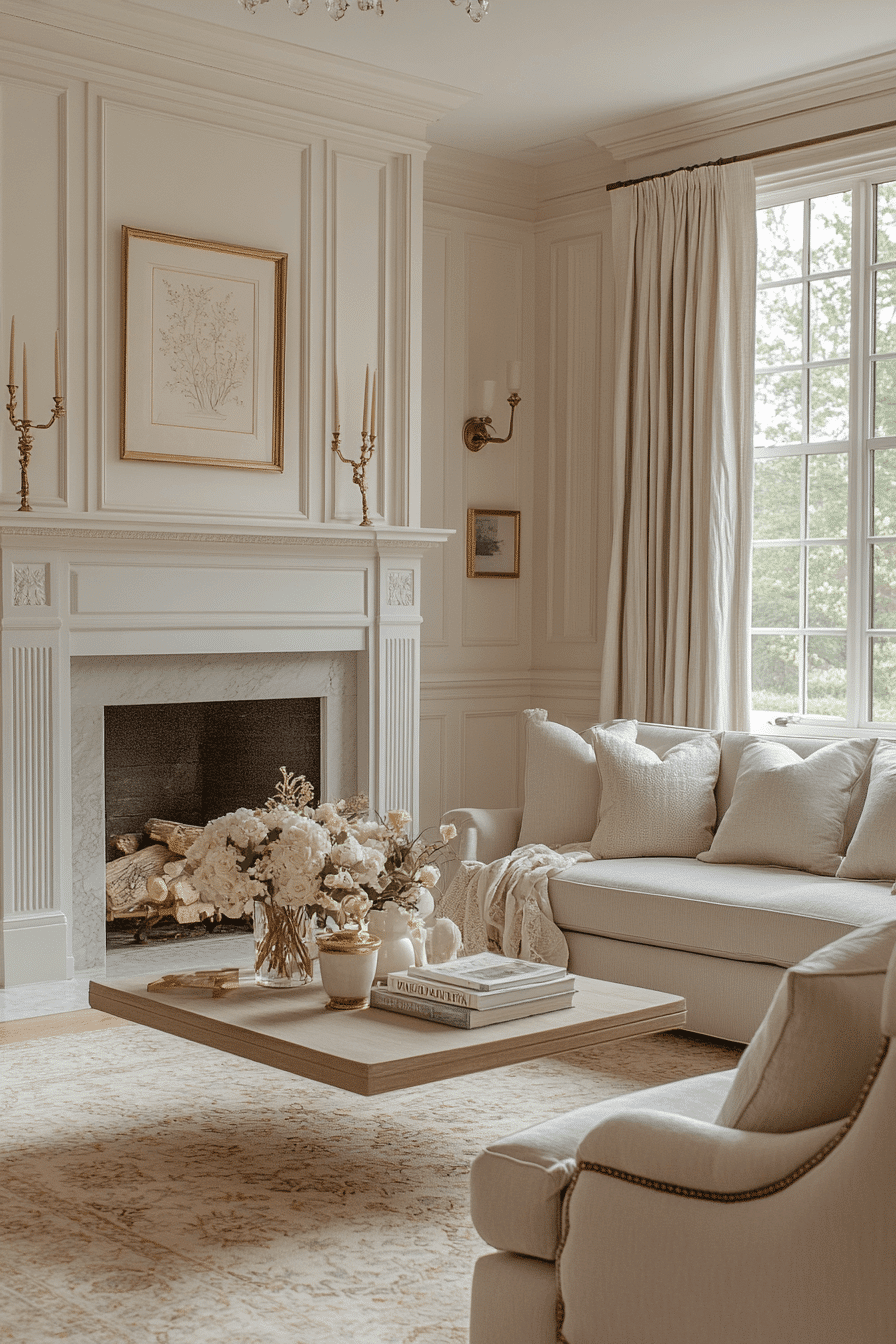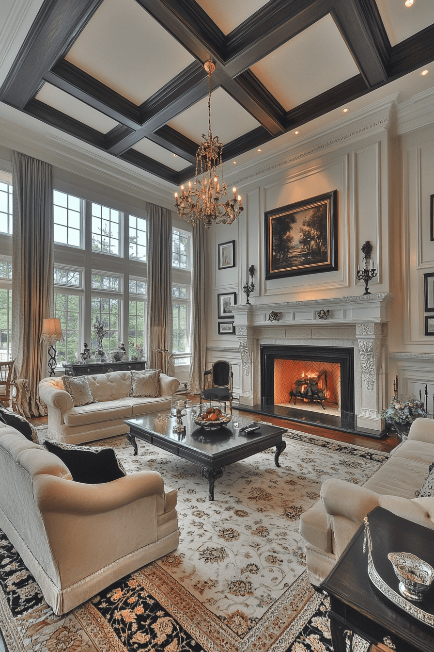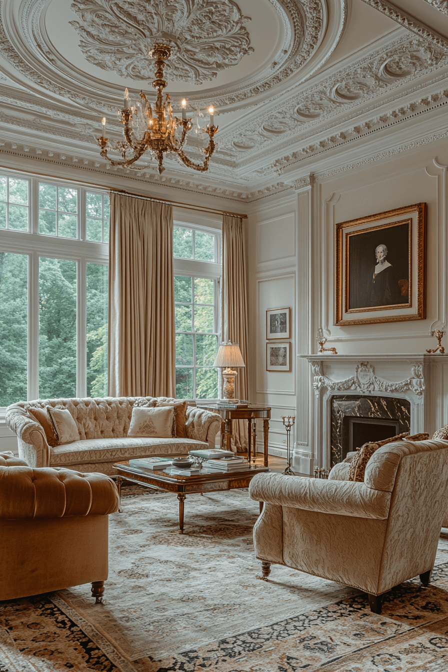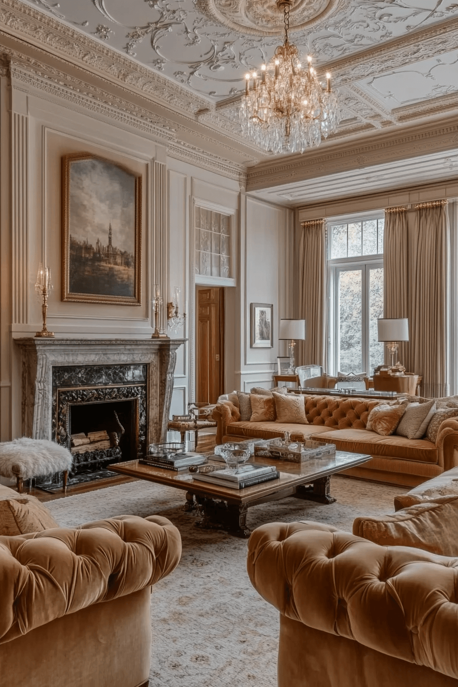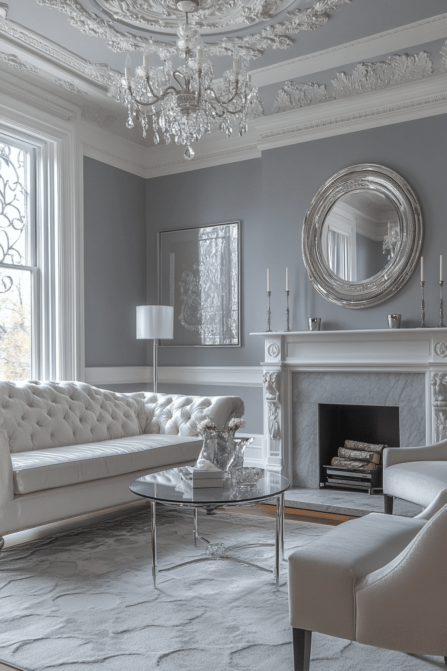 Marble accents create a polished, stately presence that elevates the entire atmosphere. Fireplaces, columns, or tabletops in marble add structural beauty and visual clarity. Silver and slate furnishings pair effortlessly with the stone textures. Crystal chandeliers reflect elegantly off the polished surfaces. High ceilings intensify the sense of sophistication.
