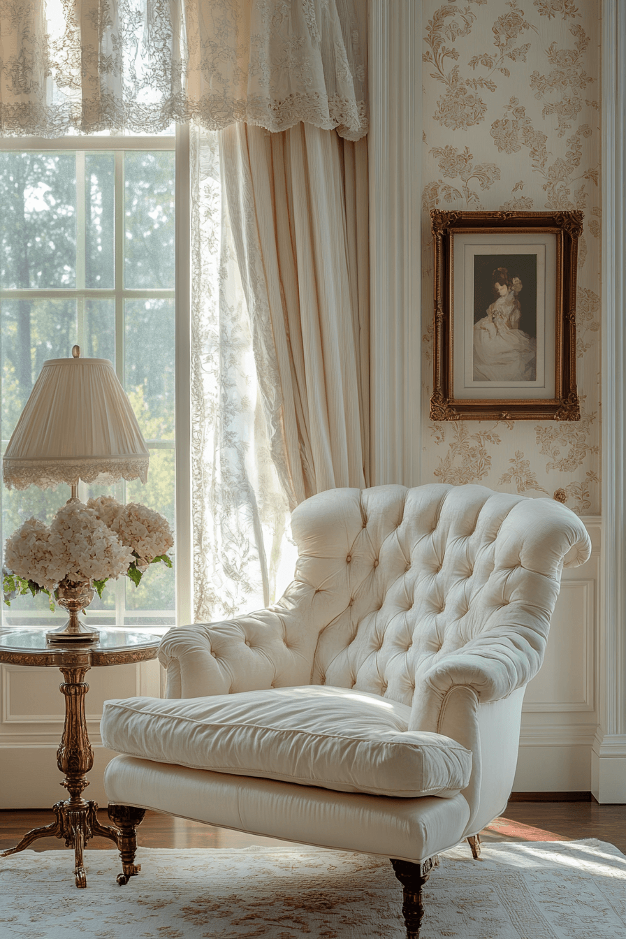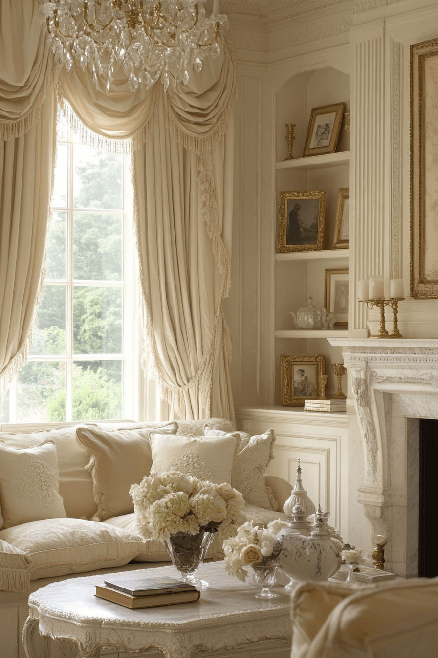 Soft cream tones build a serene atmosphere filled with quiet beauty. Delicate patterns on wallpaper and textiles enrich the space tastefully. Distressed ivory furnishings introduce vintage charm without heaviness. Glass and brass accents scatter light gently throughout the room. Layered textures add warmth and balance to the palette.