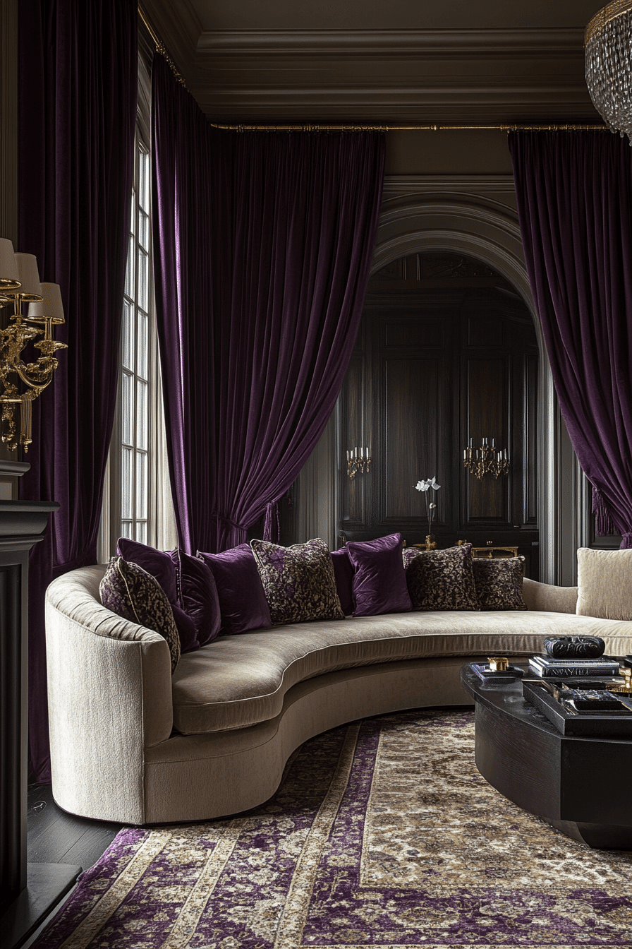Deep plum drapery envelops the room in rich, moody elegance. Neutral furnishings soften the intensity of the color while maintaining cohesion. A coordinating area rug grounds the palette beautifully. Wall sconces and candles create a warm, ambient glow. Architectural molding enhances the traditional character of the design.