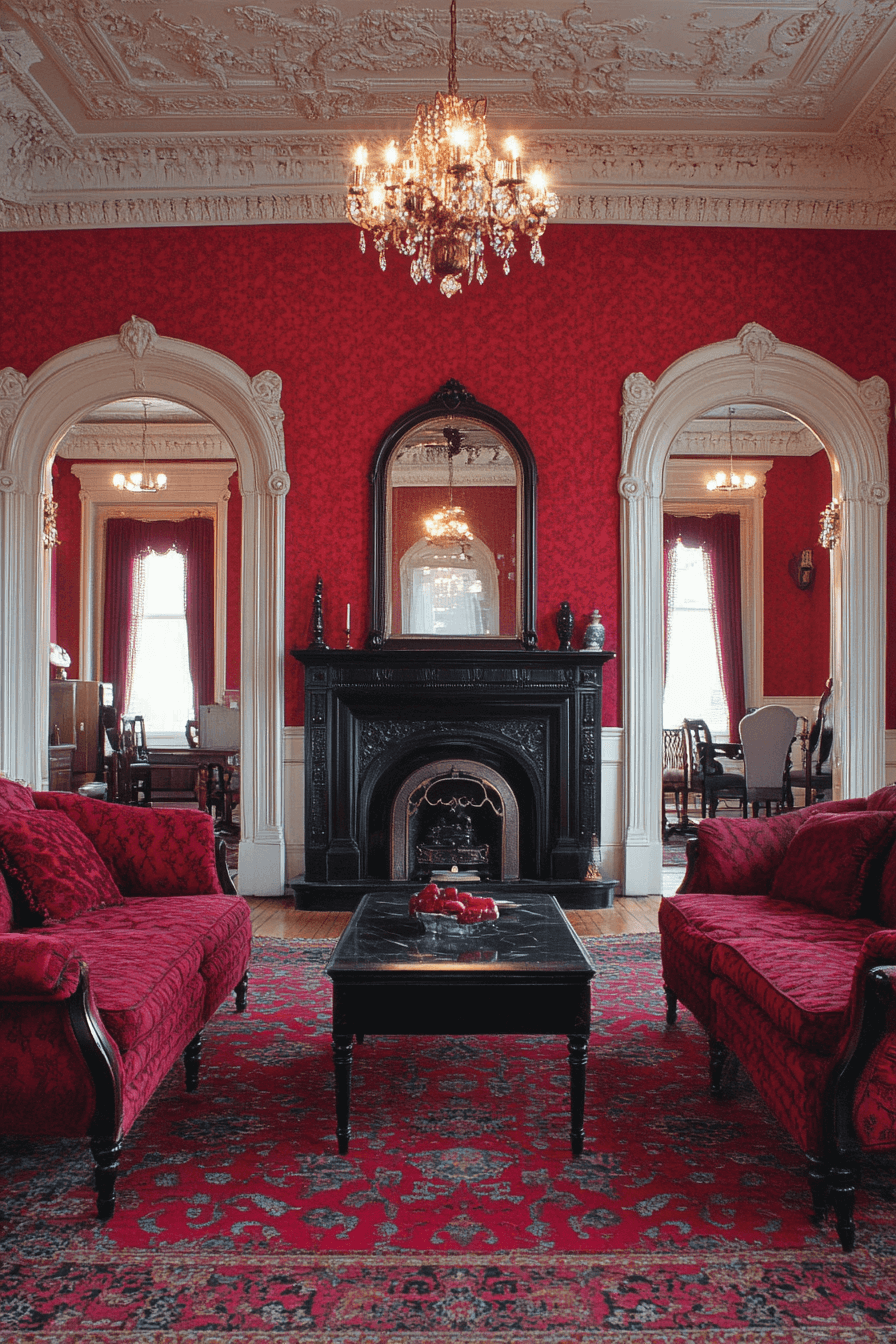 Crimson walls paired with arched woodwork create an unforgettable sense of vibrancy. Upholstered furniture in gold and white softens the bold palette. Ornate mirrors reflect the warmth of the room effortlessly. A patterned rug ties together the strong color story. Subtle lighting ensures the richness remains refined rather than overpowering.