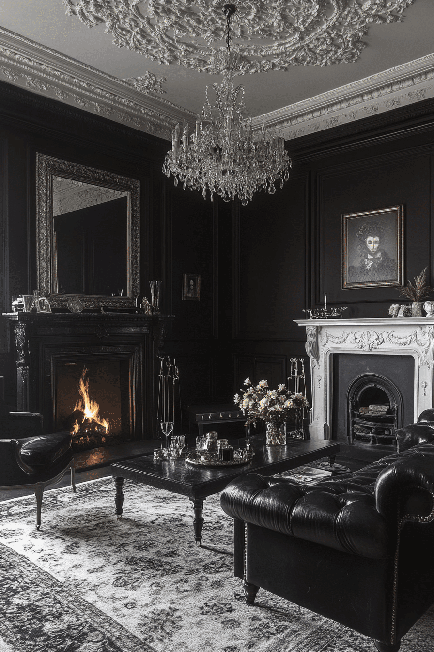 Lace-inspired textures bring poetic softness into the room. Embroidered textiles and delicate filigree details add depth without heaviness. Cream-toned furnishings allow noir elements to shine with contrast. Velvet blankets and carved wood pieces add layers of comfort. Dim lighting enhances the room’s romantic aura.