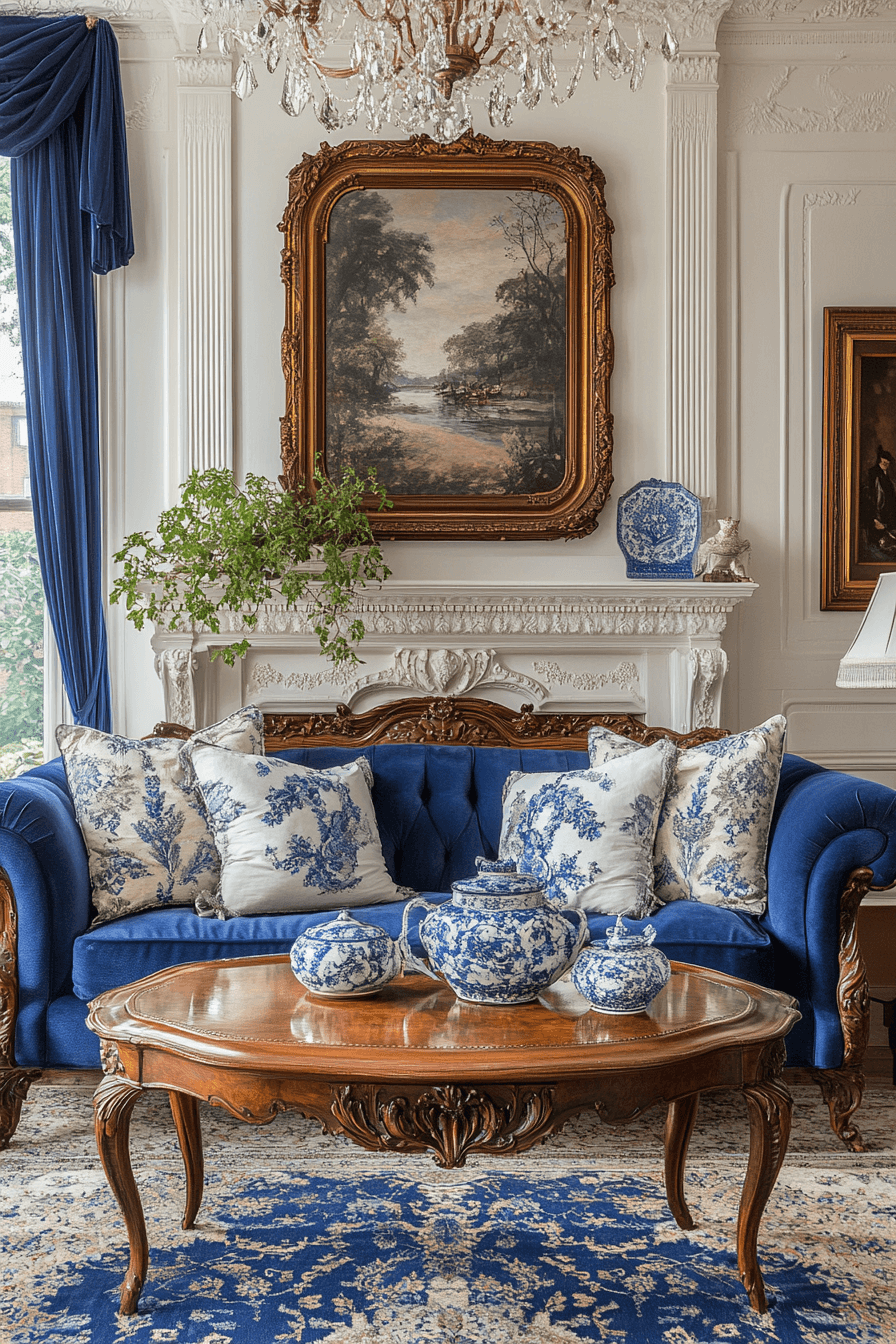 Sapphire hues introduce a romantic coolness that feels both royal and comforting. Lace-textured upholstery adds softness while maintaining a vintage edge. High-back chairs and carved legs embody timeless craftsmanship. Antique-style sconces bring gentle illumination across the room. Ceiling medallions and ornate trim complete the grandeur.