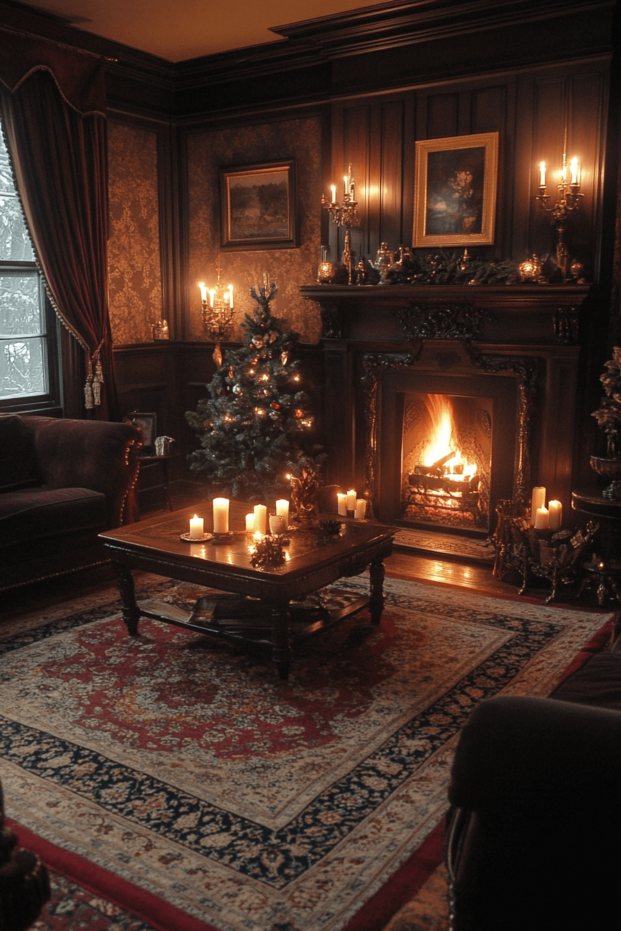 Amber-hued lighting fills the room with timeless warmth and charm. Velvet upholstery in muted tones deepens the cozy mood. Sheer curtains layered with heavier drapery create softness and privacy. Antique gold accents play beautifully with the warm glow. An oversized rug completes the inviting setup.