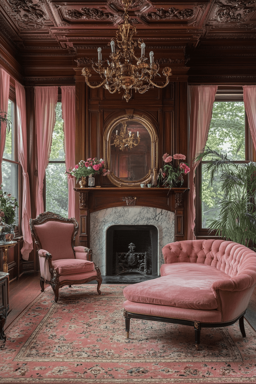 Mahogany paneling sets a foundational atmosphere filled with richness and tradition. Blush-toned fabrics soften the strength of the wood in a lovely balance. Carved chairs and rose-tinted cushions add feminine appeal. Crown molding in white uplifts the entire palette. Warm lighting blends both softness and structure.