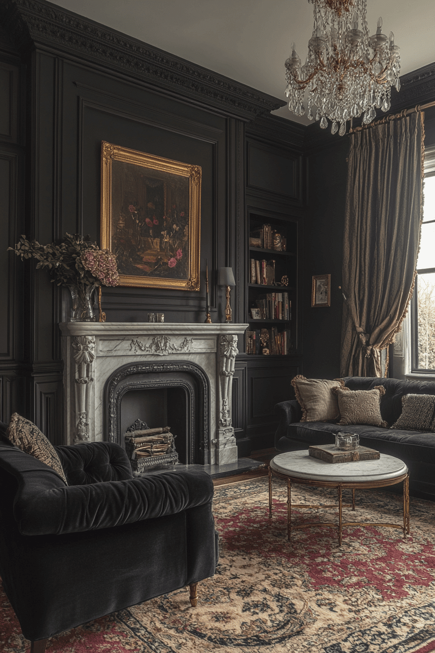 Charcoal tones bring a moody, stylish edge that instantly elevates the room. Velvet seating softens the darker palette while maintaining a luxurious feel. Embossed wallpaper adds quiet complexity without overwhelming the eye. Tall curtains frame the windows and create a dramatic vertical line. Warm brass lighting keeps the room from feeling too heavy.