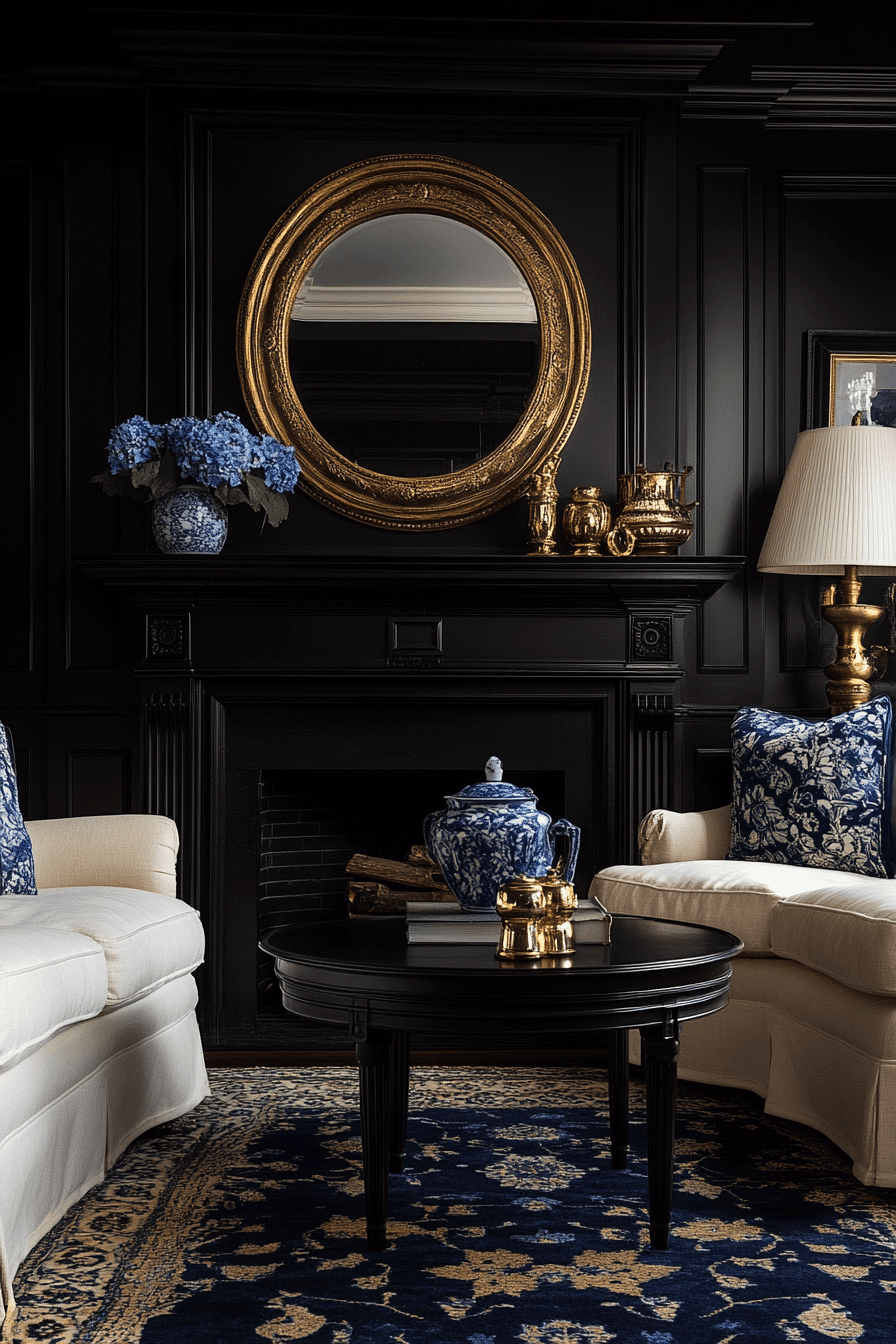 Midnight blue paneling creates depth and rich personality. Soft gray furnishings soften the dramatic color beautifully. Brass lighting reflects gently off the dark wood. Marble accents lighten the palette for balance. Ornate molding frames the architecture elegantly.