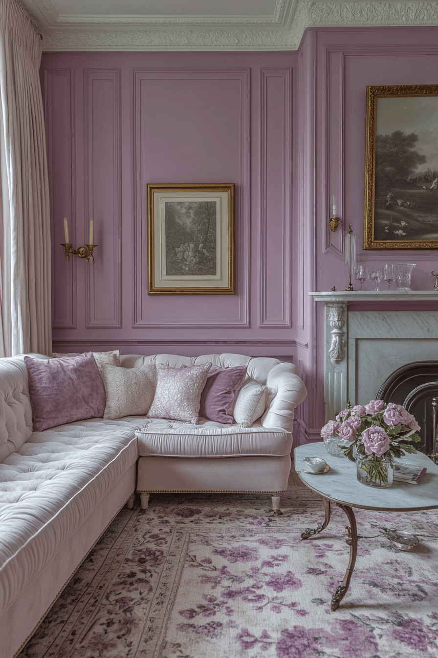 Soft mauve paneling sets a calming and regal backdrop. Wainscoting and layered trim add architectural richness. Gold lighting warms the cool-toned palette. Neutral furnishings keep the atmosphere soft and intimate. A grand chandelier strengthens the traditional mood.
