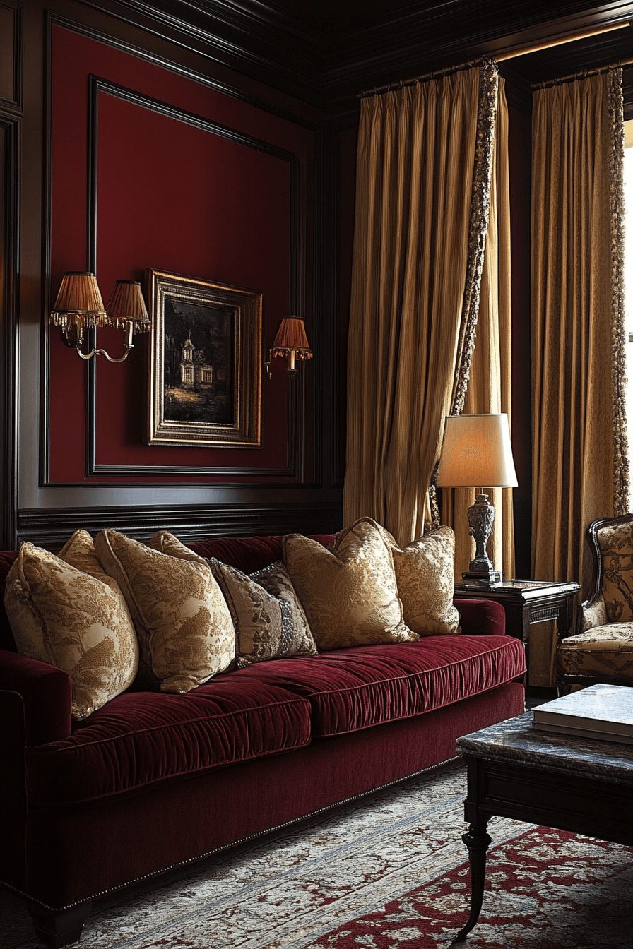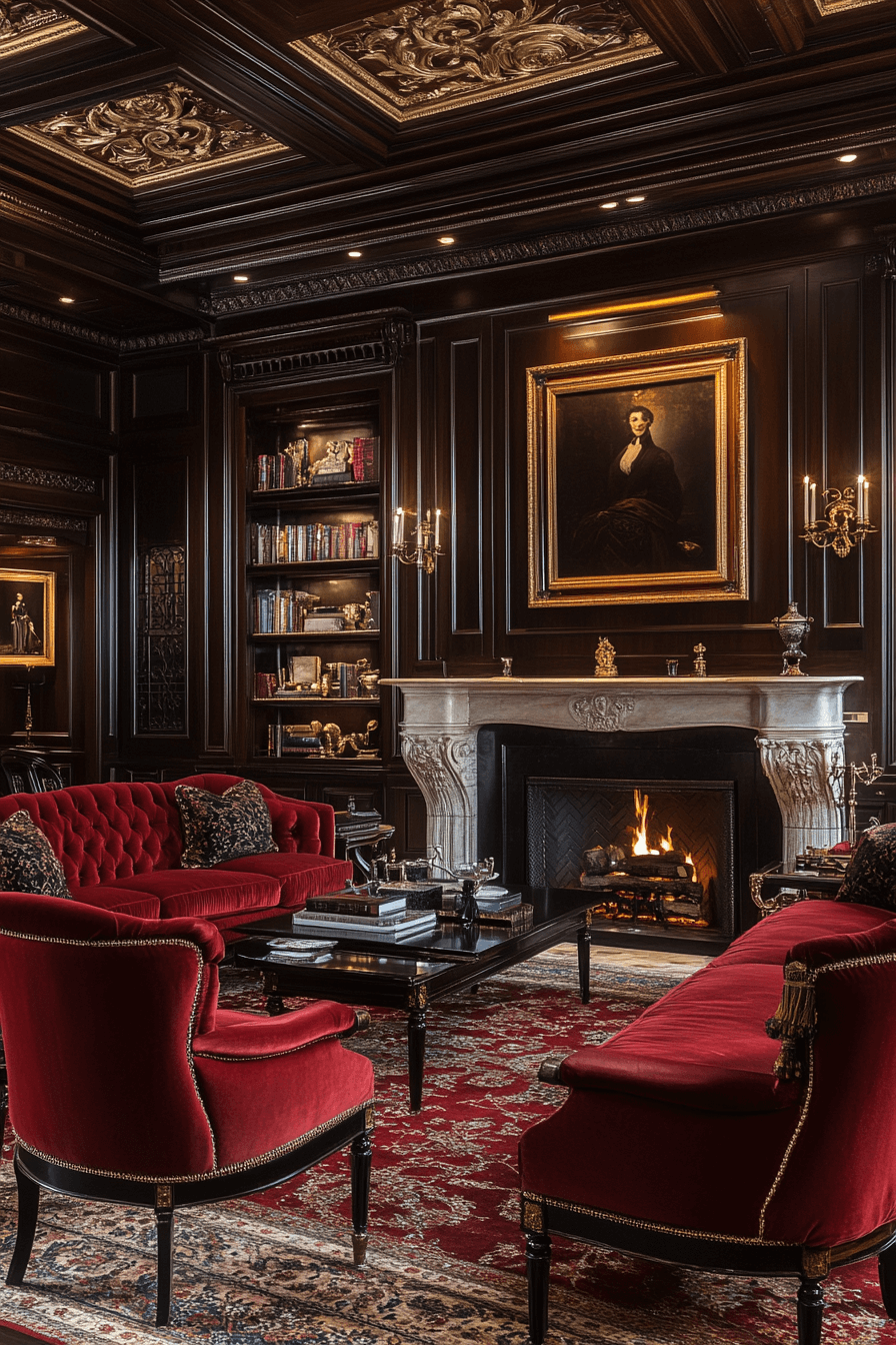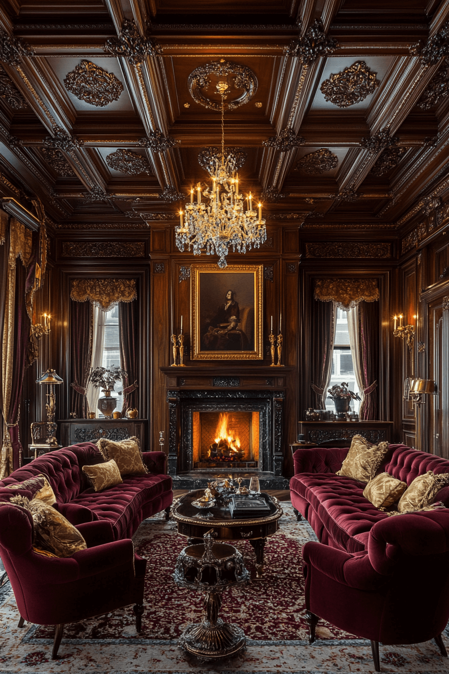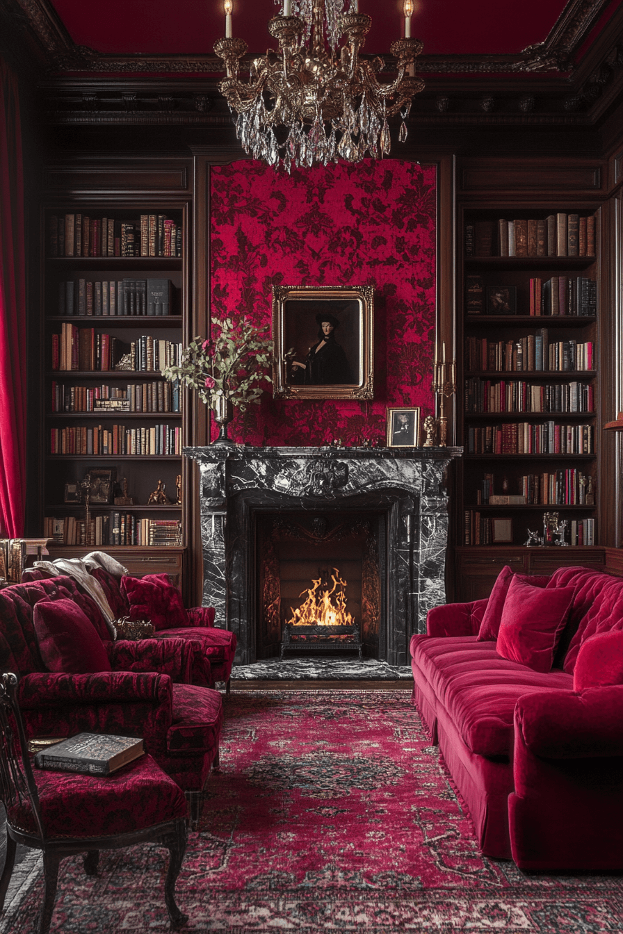 Bordeaux walls fill the space with warmth and opulence. Red velvet drapes and matching upholstery reinforce the richness. A stone fireplace adds structural beauty and grounding. Gilded details shine elegantly against the dark palette. Crystal fixtures brighten the ambiance with soft sparkle.