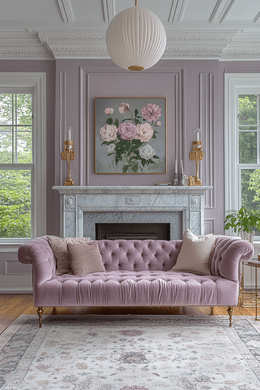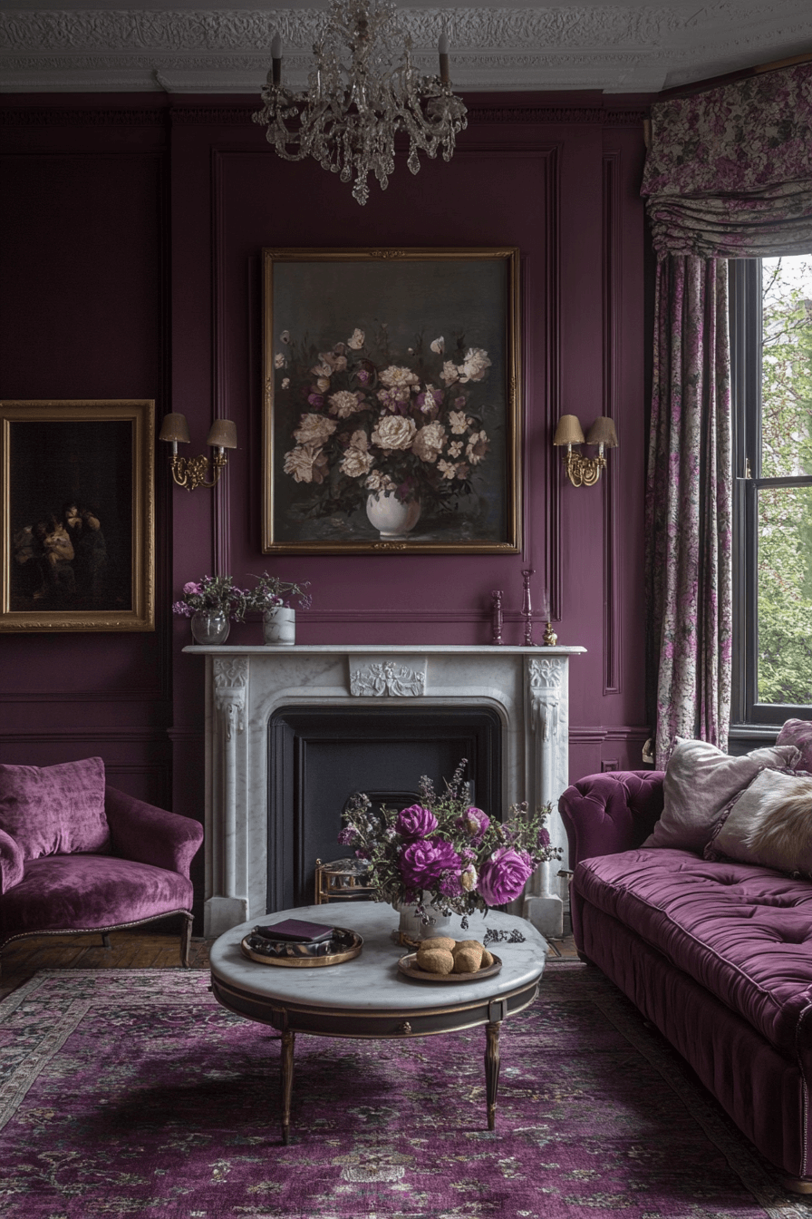 Deep aubergine hues wrap the walls in dramatic softness. Light furniture pops against the dark tones, adding airy contrast. Brass fixtures warm the cooler shades beautifully. Heavy curtains and sparkling chandeliers amplify glamour. Patterned rugs bring grounding texture.