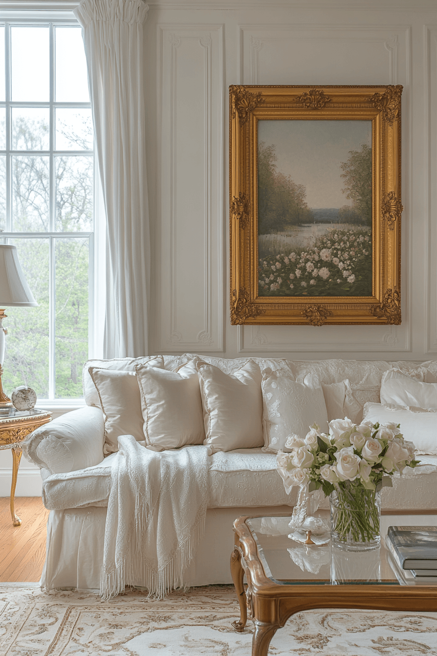 Pearl brocade fabrics introduce a gentle sheen that enhances the room’s elegance. Soft curves in the furniture create an inviting sense of flow. Gold-leaf accents provide subtle luxury without overpowering the palette. Light bounces off mirrors to amplify the brightness beautifully. Everything feels graceful and thoughtfully curated. .