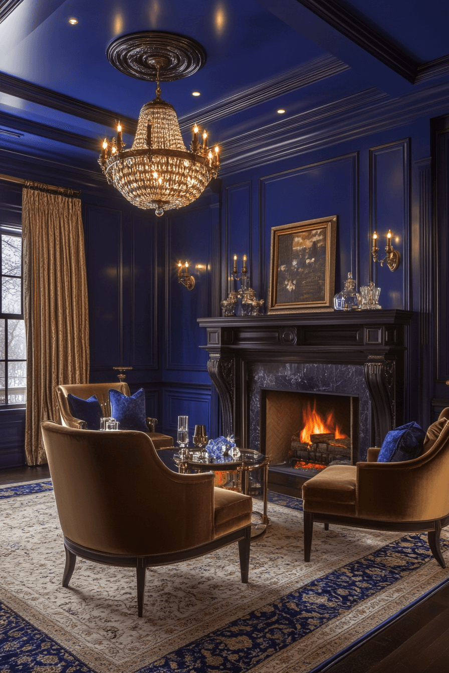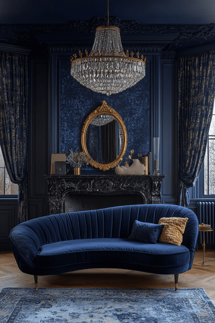 Midnight blue walls set an unforgettable backdrop that feels dramatic yet sophisticated. Gilded accents shine beautifully against the deeper tones. Velvet seating adds softness that contrasts the strong palette. Textured wallpaper enhances the historical flair of the room. A grand mirror reflects warm light throughout the space.