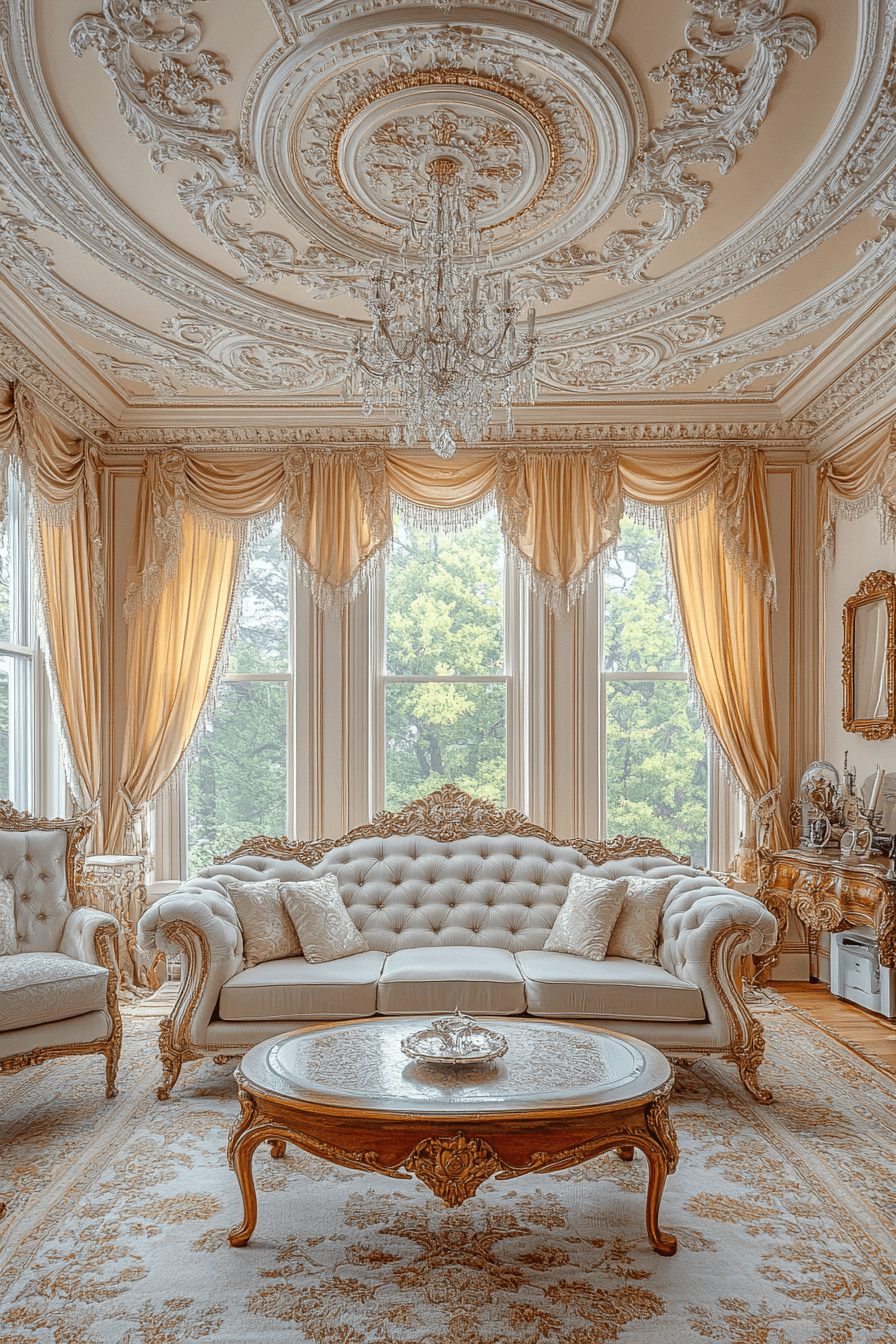 Ivory tapestry textures create an effortlessly serene room. Matching cushions and seating keep the palette cohesive and calm. Decorative ceiling plaster brings ornate charm overhead. Gold accents shimmer subtly under warm lighting. Gentle curves in the furnishings maintain a soft, elegant flow.