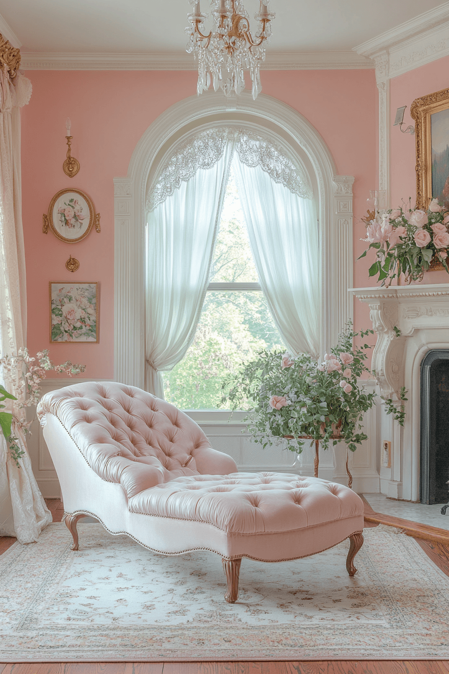 Soft blush tones create a romantic and uplifting glow that brightens the entire room. Flowing curtains and gentle textiles enhance the feminine charm. A tufted chaise adds elegance and comfort near a bright window. Gold details introduce subtle sparkle throughout the design. Floral accents reinforce the sweet and cohesive palette.
